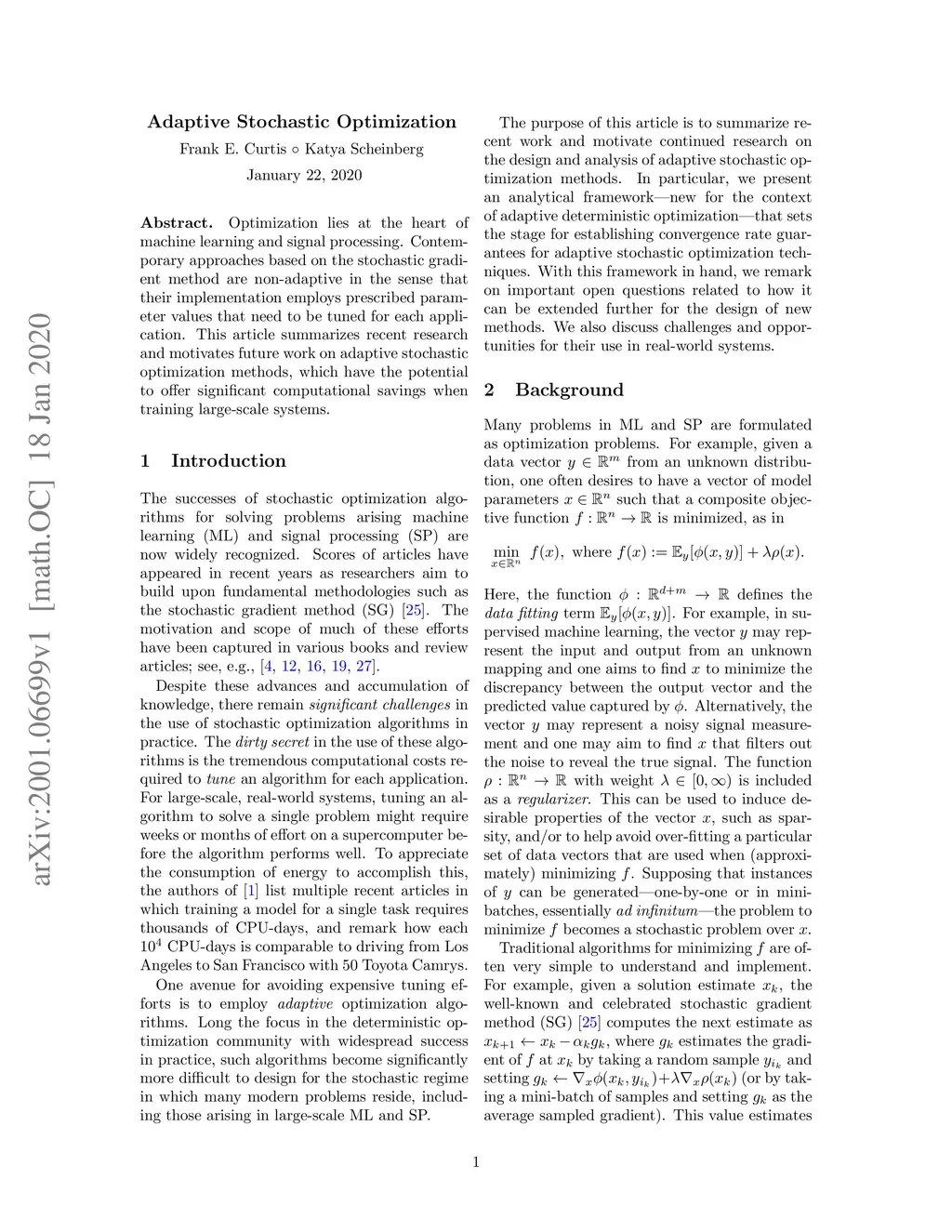 Optimization lies at the heart of machine learning and signal processing. Contemporary approaches based on the stochastic gradient method are non-adaptive in the sense that their implementation employs prescribed parameter values that need to be tuned for each application. This article summarizes recent research and motivates future work on adaptive stochastic optimization methods, which have the potential to offer significant computational savings when training large-scale systems.