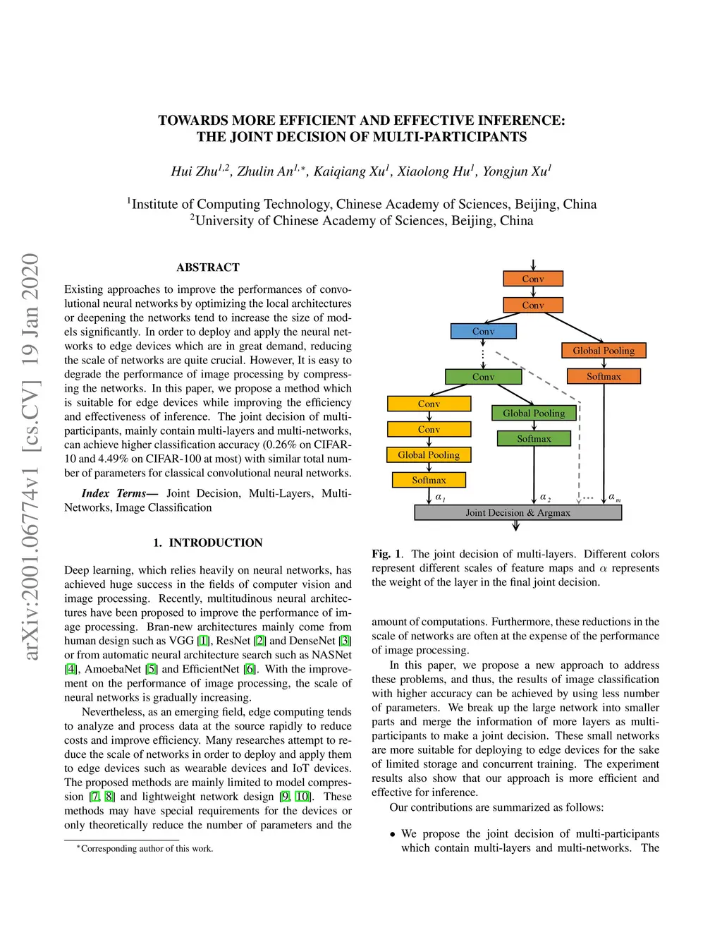Existing approaches to improve the performances of convolutional neural networks by optimizing the local architectures or deepening the networks tend to increase the size of models significantly. In order to deploy and apply the neural networks to edge devices which are in great demand, reducing the scale of networks are quite crucial. However, It is easy to degrade the performance of image processing by compressing the networks. In this paper, we propose a method which is suitable for edge devices while improving the efficiency and effectiveness of inference. The joint decision of multi-participants, mainly contain multi-layers and multi-networks, can achieve higher classification accuracy (0.26% on CIFAR-10 and 4.49% on CIFAR-100 at most) with similar total number of parameters for classical convolutional neural networks.