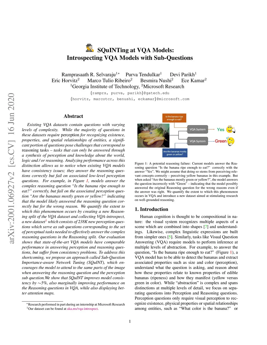 Existing VQA datasets contain questions with varying levels of complexity. While the majority of questions in these datasets require perception for recognizing existence, properties, and spatial relationships of entities, a significant portion of questions pose challenges that correspond to reasoning tasks - tasks that can only be answered through a synthesis of perception and knowledge about the world, logic and / or reasoning. Analyzing performance across this distinction allows us to notice when existing VQA models have consistency issues; they answer the reasoning questions correctly but fail on associated low-level perception questions. For example, in Figure 1, models answer the complex reasoning question "Is the banana ripe enough to eat?" correctly, but fail on the associated perception question "Are the bananas mostly green or yellow?" indicating that the model likely answered the reasoning question correctly but for the wrong reason. We quantify the extent to which this phenomenon occurs by creating a new Reasoning split of the VQA dataset and collecting VQA-introspect, a new dataset1 which consists of 238K new perception questions which serve as sub questions corresponding to the set of perceptual tasks needed to effectively answer the complex reasoning questions in the Reasoning split. Our evaluation shows that state-of-the-art VQA models have comparable performance in answering perception and reasoning questions, but suffer from consistency problems. To address this shortcoming, we propose an approach called Sub-Question Importance-aware Network Tuning (SQuINT), which encourages the model to attend to the same parts of the image when answering the reasoning question and the perception sub question. We show that SQuINT improves model consistency by ~5%, also marginally improving performance on the Reasoning questions in VQA, while also displaying better attention maps.