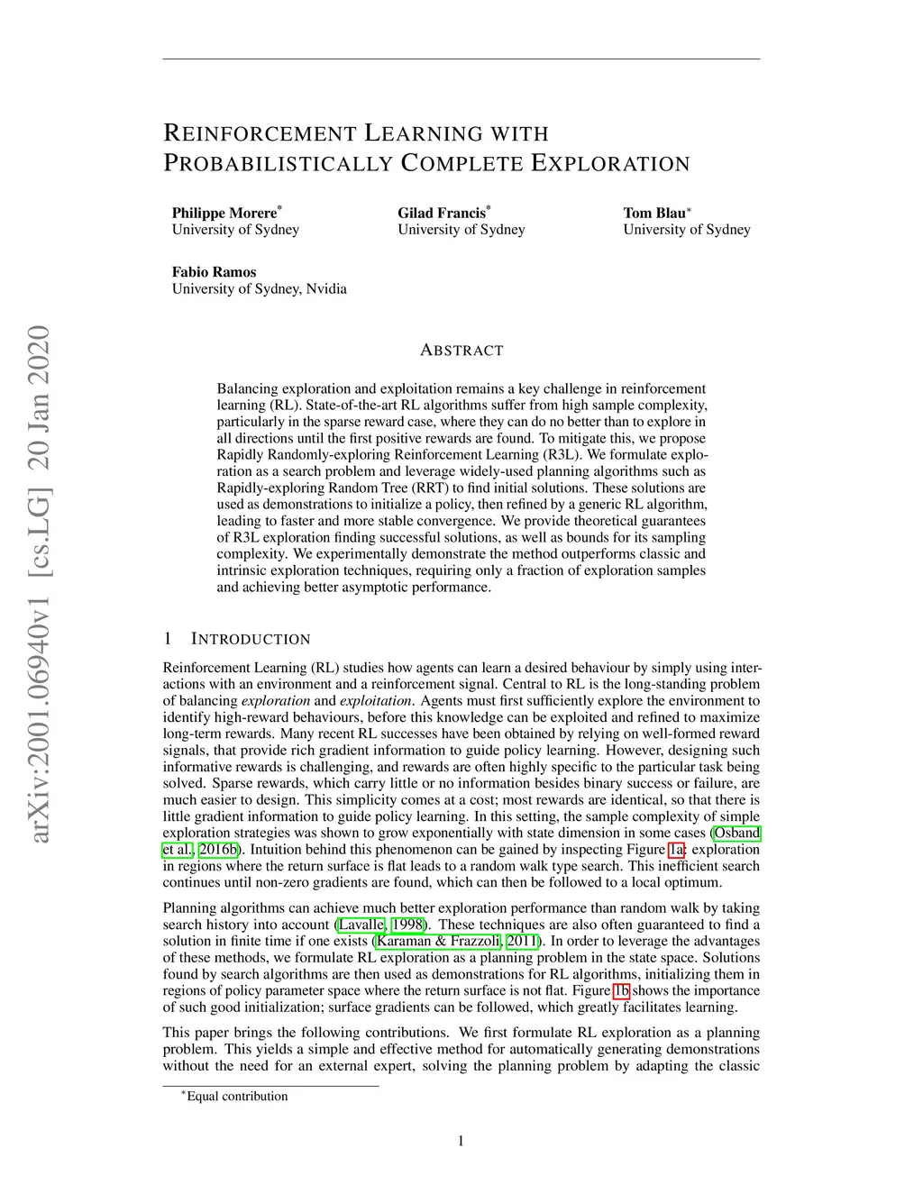 Balancing exploration and exploitation remains a key challenge in reinforcement learning (RL). State-of-the-art RL algorithms suffer from high sample complexity, particularly in the sparse reward case, where they can do no better than to explore in all directions until the first positive rewards are found. To mitigate this, we propose Rapidly Randomly-exploring Reinforcement Learning (R3L). We formulate exploration as a search problem and leverage widely-used planning algorithms such as Rapidly-exploring Random Tree (RRT) to find initial solutions. These solutions are used as demonstrations to initialize a policy, then refined by a generic RL algorithm, leading to faster and more stable convergence. We provide theoretical guarantees of R3L exploration finding successful solutions, as well as bounds for its sampling complexity. We experimentally demonstrate the method outperforms classic and intrinsic exploration techniques, requiring only a fraction of exploration samples and achieving better asymptotic performance.