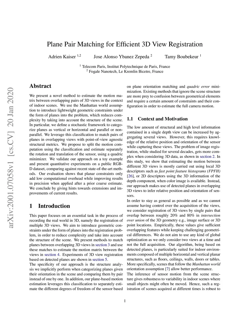 We present a novel method to estimate the motion matrix between overlapping pairs of 3D views in the context of indoor scenes. We use the Manhattan world assumption to introduce lightweight geometric constraints under the form of planes into the problem, which reduces complexity by taking into account the structure of the scene. In particular, we define a stochastic framework to categorize planes as vertical or horizontal and parallel or non-parallel. We leverage this classification to match pairs of planes in overlapping views with point-of-view agnostic structural metrics. We propose to split the motion computation using the classification and estimate separately the rotation and translation of the sensor, using a quadric minimizer. We validate our approach on a toy example and present quantitative experiments on a public RGB-D dataset, comparing against recent state-of-the-art methods. Our evaluation shows that planar constraints only add low computational overhead while improving results in precision when applied after a prior coarse estimate. We conclude by giving hints towards extensions and improvements of current results.