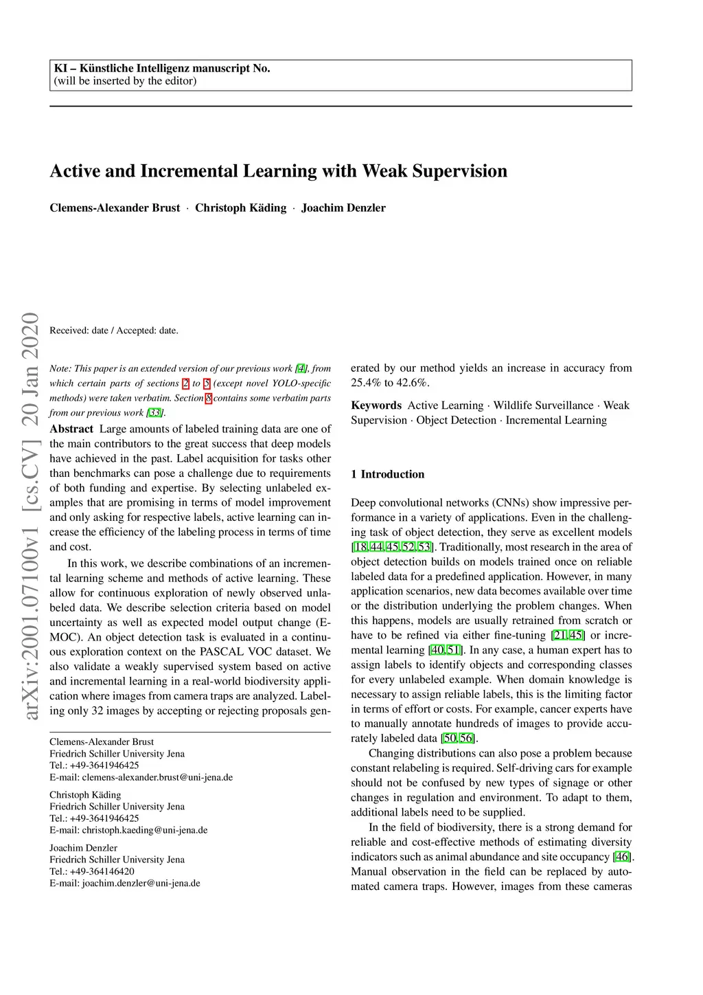 Large amounts of labeled training data are one of the main contributors to the great success that deep models have achieved in the past. Label acquisition for tasks other than benchmarks can pose a challenge due to requirements of both funding and expertise. By selecting unlabeled examples that are promising in terms of model improvement and only asking for respective labels, active learning can increase the efficiency of the labeling process in terms of time and cost. In this work, we describe combinations of an incremental learning scheme and methods of active learning. These allow for continuous exploration of newly observed unlabeled data. We describe selection criteria based on model uncertainty as well as expected model output change (EMOC). An object detection task is evaluated in a continuous exploration context on the PASCAL VOC dataset. We also validate a weakly supervised system based on active and incremental learning in a real-world biodiversity application where images from camera traps are analyzed. Labeling only 32 images by accepting or rejecting proposals generated by our method yields an increase in accuracy from 25.4% to 42.6%.