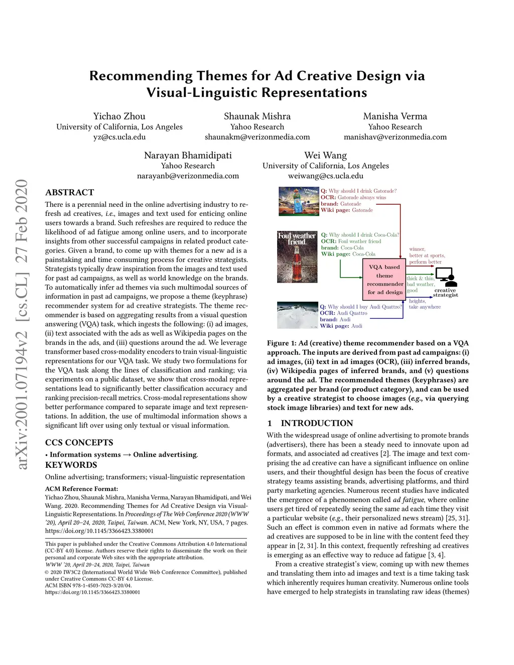 There is a perennial need in the online advertising industry to refresh ad creatives, i.e., images and text used for enticing online users towards a brand. Such refreshes are required to reduce the likelihood of ad fatigue among online users, and to incorporate insights from other successful campaigns in related product categories. Given a brand, to come up with themes for a new ad is a painstaking and time consuming process for creative strategists. Strategists typically draw inspiration from the images and text used for past ad campaigns, as well as world knowledge on the brands. To automatically infer ad themes via such multimodal sources of information in past ad campaigns, we propose a theme (keyphrase) recommender system for ad creative strategists. The theme recommender is based on aggregating results from a visual question answering (VQA) task, which ingests the following: (i) ad images, (ii) text associated with the ads as well as Wikipedia pages on the brands in the ads, and (iii) questions around the ad. We leverage transformer based cross-modality encoders to train visual-linguistic representations for our VQA task. We study two formulations for the VQA task along the lines of classification and ranking; via experiments on a public dataset, we show that cross-modal representations lead to significantly better classification accuracy and ranking precision-recall metrics. Cross-modal representations show better performance compared to separate image and text representations. In addition, the use of multimodal information shows a significant lift over using only textual or visual information.