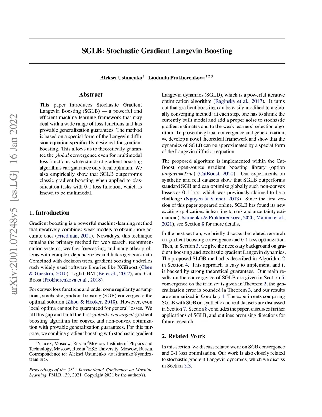 This paper introduces Stochastic Gradient Langevin Boosting (SGLB) - a powerful and efficient machine learning framework that may deal with a wide range of loss functions and has provable generalization guarantees. The method is based on a special form of the Langevin diffusion equation specifically designed for gradient boosting. This allows us to theoretically guarantee the global convergence even for multimodal loss functions, while standard gradient boosting algorithms can guarantee only local optimum. We also empirically show that SGLB outperforms classic gradient boosting when applied to classification tasks with 0-1 loss function, which is known to be multimodal.
