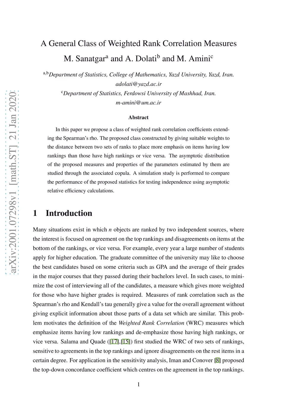 In this paper we propose a class of weighted rank correlation coefficients extending the Spearman's rho. The proposed class constructed by giving suitable weights to the distance between two sets of ranks to place more emphasis on items having low rankings than those have high rankings or vice versa. The asymptotic distribution of the proposed measures and properties of the parameters estimated by them are studied through the associated copula. A simulation study is performed to compare the performance of the proposed statistics for testing independence using asymptotic relative efficiency calculations.