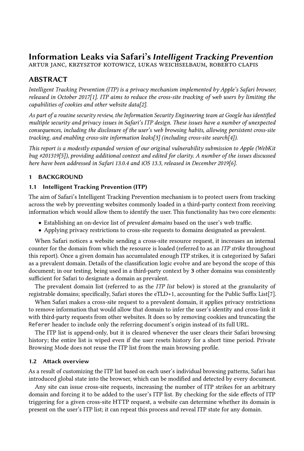 Intelligent Tracking Prevention (ITP) is a privacy mechanism implemented by Apple's Safari browser, released in October 2017. ITP aims to reduce the cross-site tracking of web users by limiting the capabilities of cookies and other website data. As part of a routine security review, the Information Security Engineering team at Google has identified multiple security and privacy issues in Safari's ITP design. These issues have a number of unexpected consequences, including the disclosure of the user's web browsing habits, allowing persistent cross-site tracking, and enabling cross-site information leaks (including cross-site search). This report is a modestly expanded version of our original vulnerability submission to Apple (WebKit bug #201319), providing additional context and edited for clarity. A number of the issues discussed here have been addressed in Safari 13.0.4 and iOS 13.3, released in December 2019.