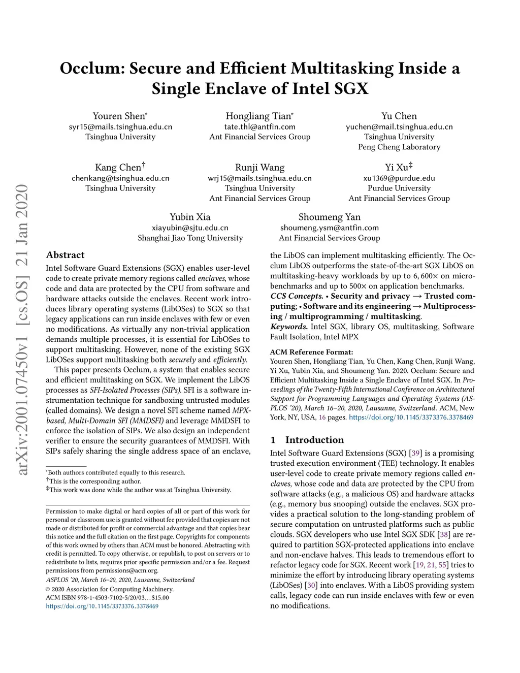 Occlum: Secure and Efficient Multitasking Inside a Single Enclave of