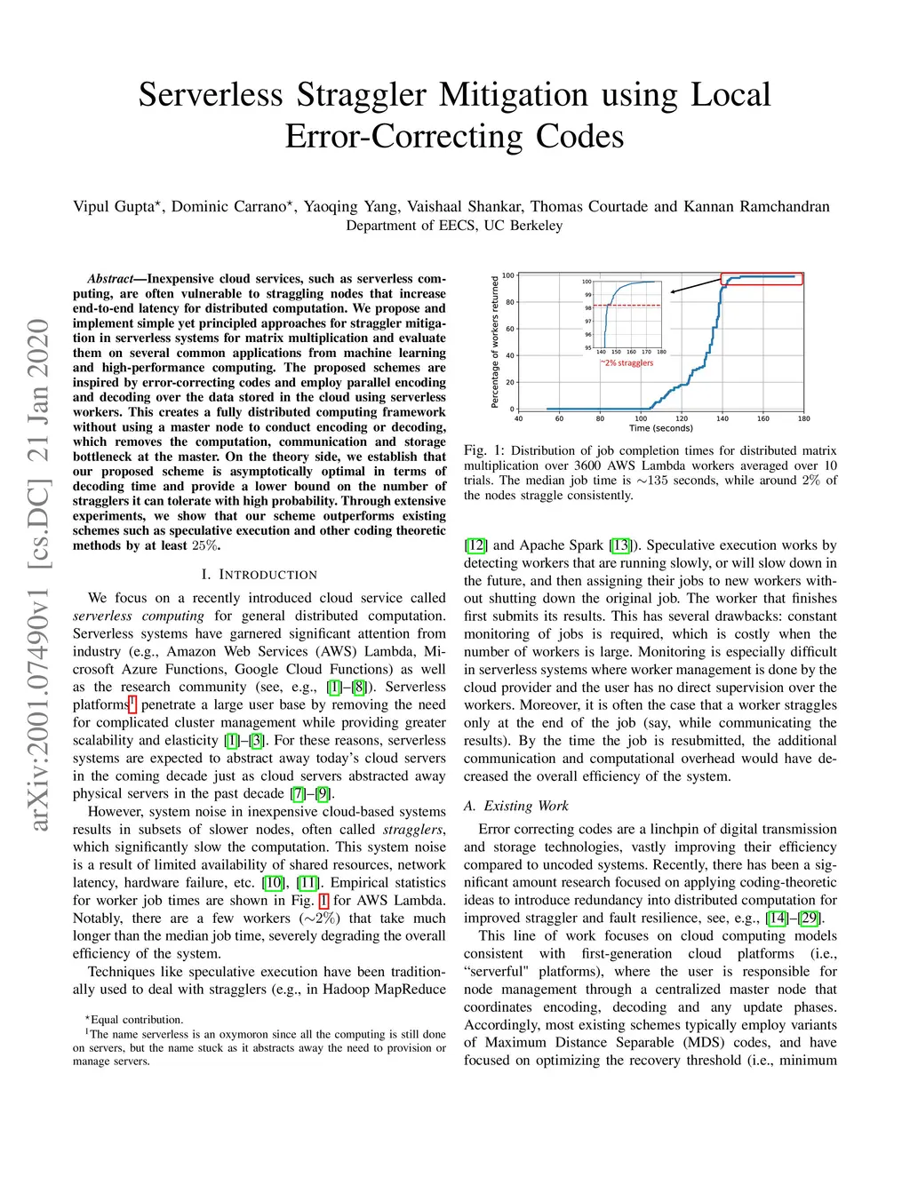 Inexpensive cloud services, such as serverless computing, are often vulnerable to straggling nodes that increase end-to-end latency for distributed computation. We propose and implement simple yet principled approaches for straggler mitigation in serverless systems for matrix multiplication and evaluate them on several common applications from machine learning and high-performance computing. The proposed schemes are inspired by error-correcting codes and employ parallel encoding and decoding over the data stored in the cloud using serverless workers. This creates a fully distributed computing framework without using a master node to conduct encoding or decoding, which removes the computation, communication and storage bottleneck at the master. On the theory side, we establish that our proposed scheme is asymptotically optimal in terms of decoding time and provide a lower bound on the number of stragglers it can tolerate with high probability. Through extensive experiments, we show that our scheme outperforms existing schemes such as speculative execution and other coding theoretic methods by at least 25%.