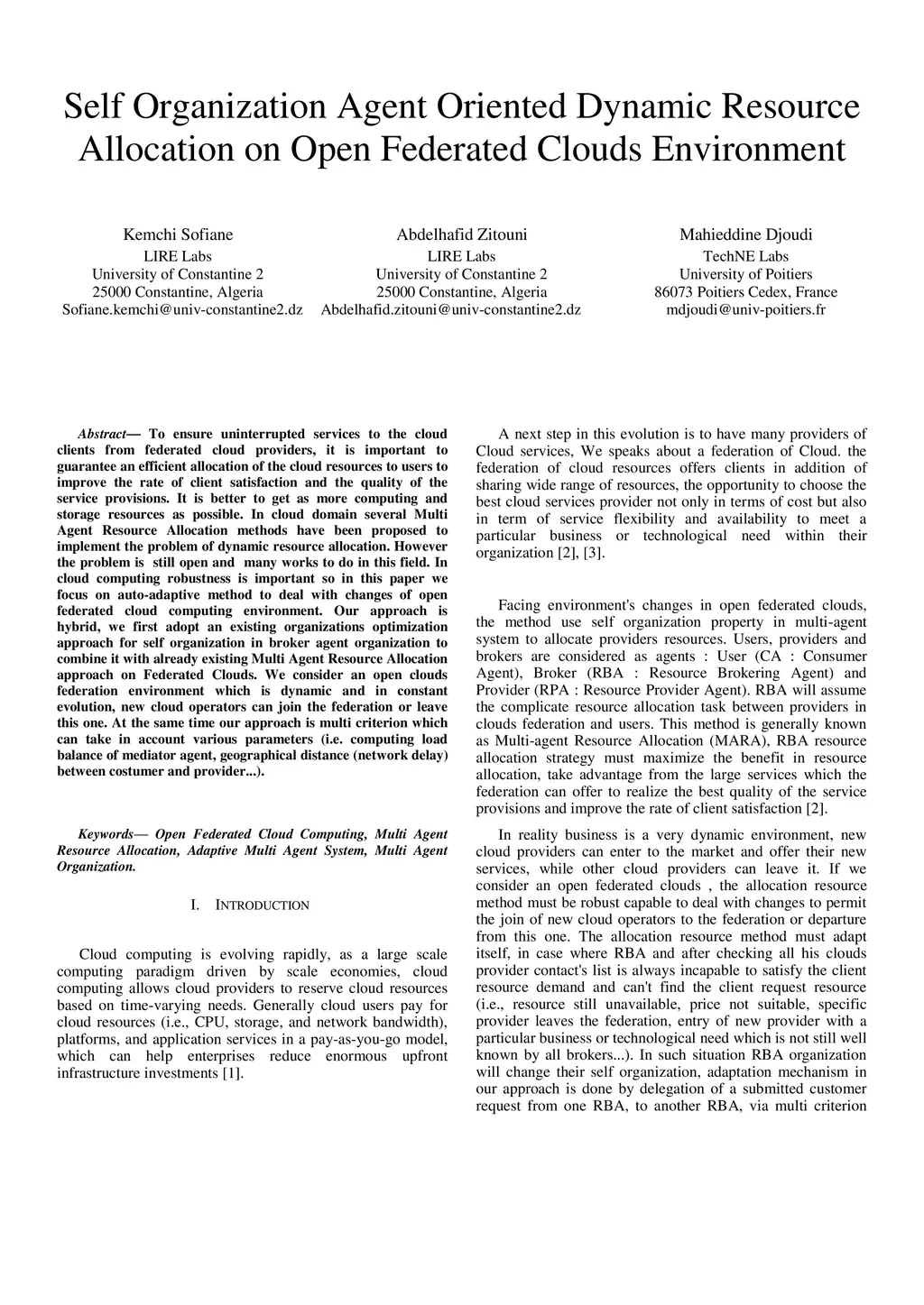 To ensure uninterrupted services to the cloud clients from federated cloud providers, it is important to guarantee an efficient allocation of the cloud resources to users to improve the rate of client satisfaction and the quality of the service provisions. It is better to get as more computing and storage resources as possible. In cloud domain several Multi Agent Resource Allocation methods have been proposed to implement the problem of dynamic resource allocation. However the problem is still open and many works to do in this field. In cloud computing robustness is important so in this paper we focus on auto-adaptive method to deal with changes of open federated cloud computing environment. Our approach is hybrid, we first adopt an existing organizations optimization approach for self organization in broker agent organization to combine it with already existing Multi Agent Resource Allocation approach on Federated Clouds. We consider an open clouds federation environment which is dynamic and in constant evolution, new cloud operators can join the federation or leave this one. At the same time our approach is multi criterion which can take in account various parameters (i.e. computing load balance of mediator agent, geographical distance (network delay) between costumer and provider...).