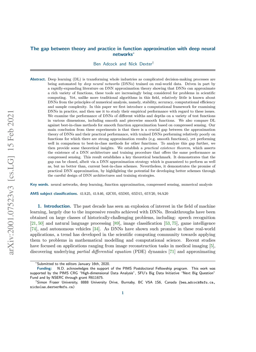 Deep learning (DL) is transforming industry as decision-making processes are being automated by deep neural networks (DNNs) trained on real-world data. Driven partly by rapidly-expanding literature on DNN approximation theory showing they can approximate a rich variety of functions, such tools are increasingly being considered for problems in scientific computing. Yet, unlike traditional algorithms in this field, little is known about DNNs from the principles of numerical analysis, e.g., stability, accuracy, computational efficiency and sample complexity. In this paper we introduce a computational framework for examining DNNs in practice, and use it to study empirical performance with regard to these issues. We study performance of DNNs of different widths & depths on test functions in various dimensions, including smooth and piecewise smooth functions. We also compare DL against best-in-class methods for smooth function approx. based on compressed sensing (CS). Our main conclusion from these experiments is that there is a crucial gap between the approximation theory of DNNs and their practical performance, with trained DNNs performing relatively poorly on functions for which there are strong approximation results (e.g. smooth functions), yet performing well in comparison to best-in-class methods for other functions. To analyze this gap further, we provide some theoretical insights. We establish a practical existence theorem, asserting existence of a DNN architecture and training procedure that offers the same performance as CS. This establishes a key theoretical benchmark, showing the gap can be closed, albeit via a strategy guaranteed to perform as well as, but no better than, current best-in-class schemes. Nevertheless, it demonstrates the promise of practical DNN approx., by highlighting potential for better schemes through careful design of DNN architectures and training strategies.