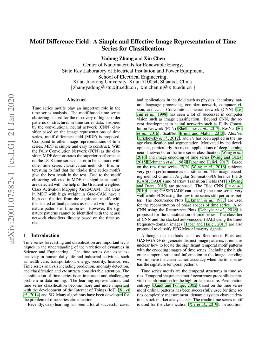 Time series motifs play an important role in the time series analysis. The motif-based time series clustering is used for the discovery of higher-order patterns or structures in time series data. Inspired by the convolutional neural network (CNN) classifier based on the image representations of time series, motif difference field (MDF) is proposed. Compared to other image representations of time series, MDF is simple and easy to construct. With the Fully Convolution Network (FCN) as the classifier, MDF demonstrates the superior performance on the UCR time series dataset in benchmark with other time series classification methods. It is interesting to find that the triadic time series motifs give the best result in the test. Due to the motif clustering reflected in MDF, the significant motifs are detected with the help of the Gradient-weighted Class Activation Mapping (Grad-CAM). The areas in MDF with high weight in Grad-CAM have a high contribution from the significant motifs with the desired ordinal patterns associated with the signature patterns in time series. However, the signature patterns cannot be identified with the neural network classifiers directly based on the time series.