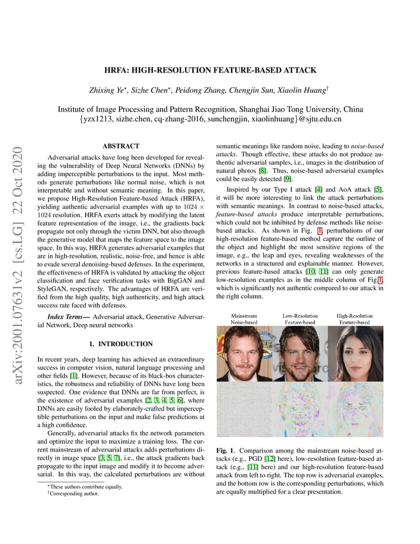 Adversarial attacks have long been developed for revealing the vulnerability of Deep Neural Networks (DNNs) by adding imperceptible perturbations to the input. Most methods generate perturbations like normal noise, which is not interpretable and without semantic meaning. In this paper, we propose High-Resolution Feature-based Attack (HRFA), yielding authentic adversarial examples with up to resolution. HRFA exerts attack by modifying the latent feature representation of the image, i.e., the gradients back propagate not only through the victim DNN, but also through the generative model that maps the feature space to the image space. In this way, HRFA generates adversarial examples that are in high-resolution, realistic, noise-free, and hence is able to evade several denoising-based defenses. In the experiment, the effectiveness of HRFA is validated by attacking the object classification and face verification tasks with BigGAN and StyleGAN, respectively. The advantages of HRFA are verified from the high quality, high authenticity, and high attack success rate faced with defenses.