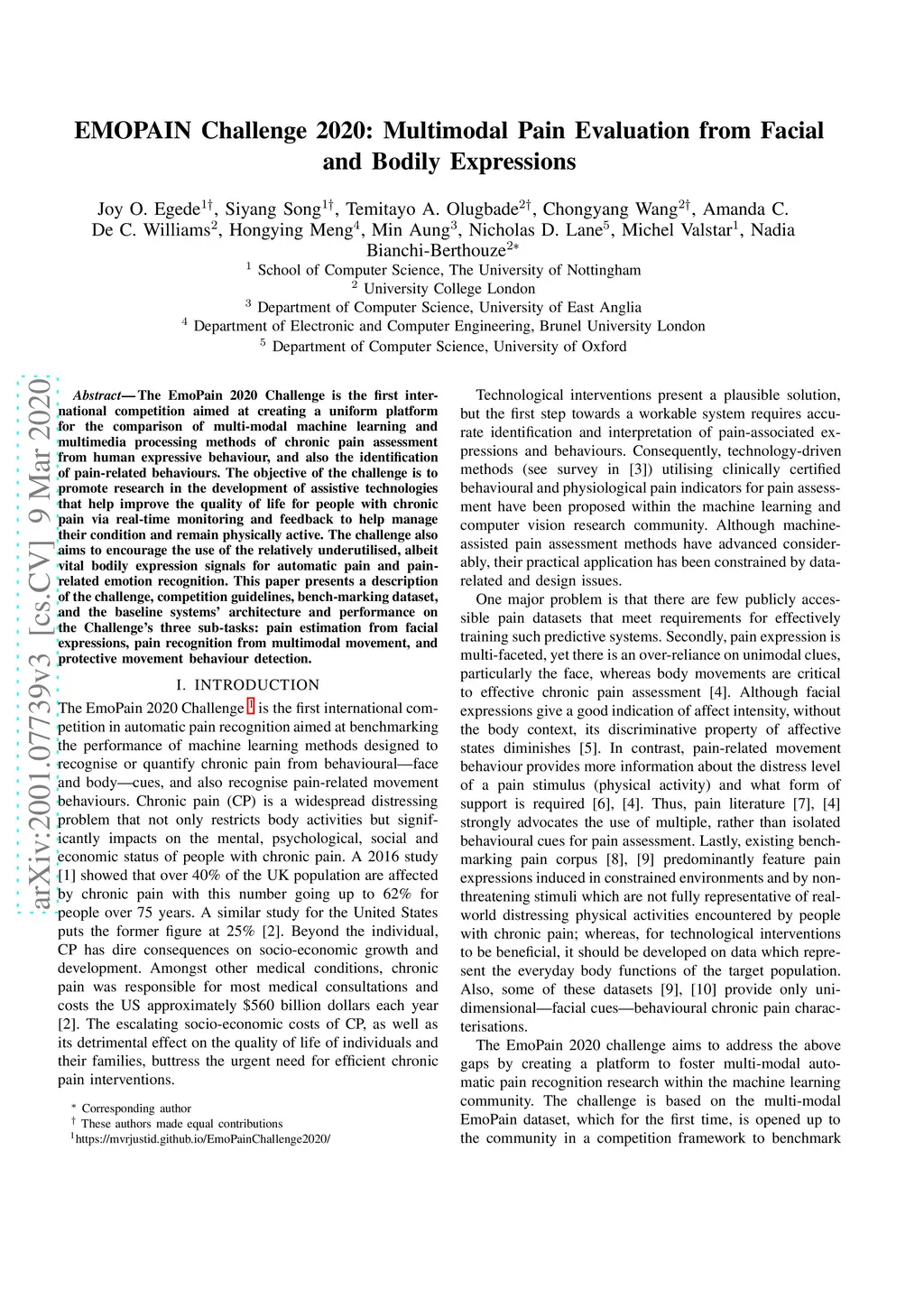 EMOPAIN Challenge 2020: Multimodal Pain Evaluation from Facial and