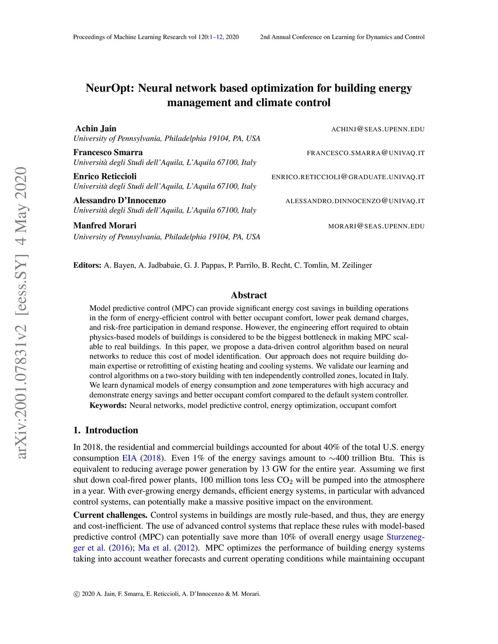 Model predictive control (MPC) can provide significant energy cost savings in building operations in the form of energy-efficient control with better occupant comfort, lower peak demand charges, and risk-free participation in demand response. However, the engineering effort required to obtain physics-based models of buildings is considered to be the biggest bottleneck in making MPC scalable to real buildings. In this paper, we propose a data-driven control algorithm based on neural networks to reduce this cost of model identification. Our approach does not require building domain expertise or retrofitting of existing heating and cooling systems. We validate our learning and control algorithms on a two-story building with ten independently controlled zones, located in Italy. We learn dynamical models of energy consumption and zone temperatures with high accuracy and demonstrate energy savings and better occupant comfort compared to the default system controller.