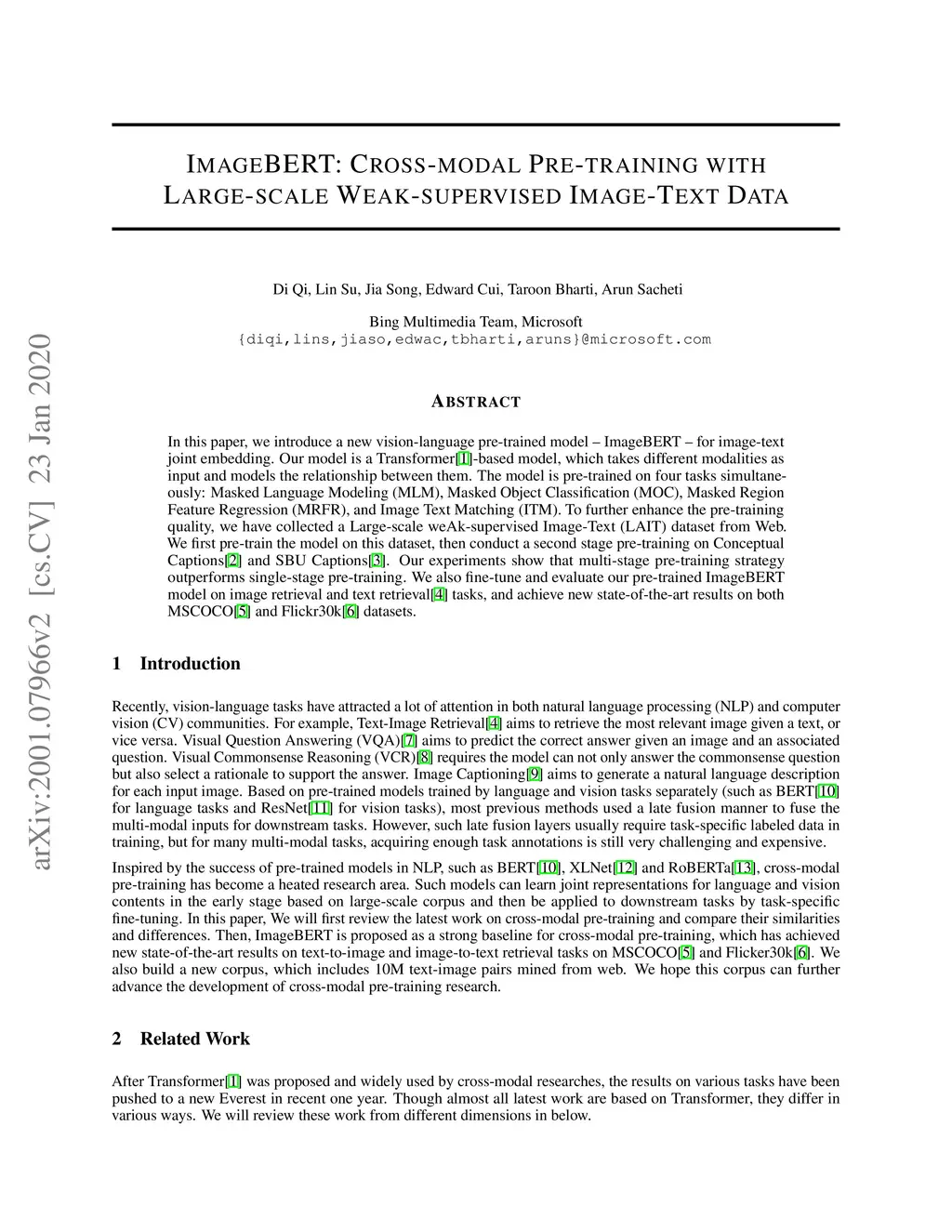 In this paper, we introduce a new vision-language pre-trained model -- ImageBERT -- for image-text joint embedding. Our model is a Transformer-based model, which takes different modalities as input and models the relationship between them. The model is pre-trained on four tasks simultaneously: Masked Language Modeling (MLM), Masked Object Classification (MOC), Masked Region Feature Regression (MRFR), and Image Text Matching (ITM). To further enhance the pre-training quality, we have collected a Large-scale weAk-supervised Image-Text (LAIT) dataset from Web. We first pre-train the model on this dataset, then conduct a second stage pre-training on Conceptual Captions and SBU Captions. Our experiments show that multi-stage pre-training strategy outperforms single-stage pre-training. We also fine-tune and evaluate our pre-trained ImageBERT model on image retrieval and text retrieval tasks, and achieve new state-of-the-art results on both MSCOCO and Flickr30k datasets.