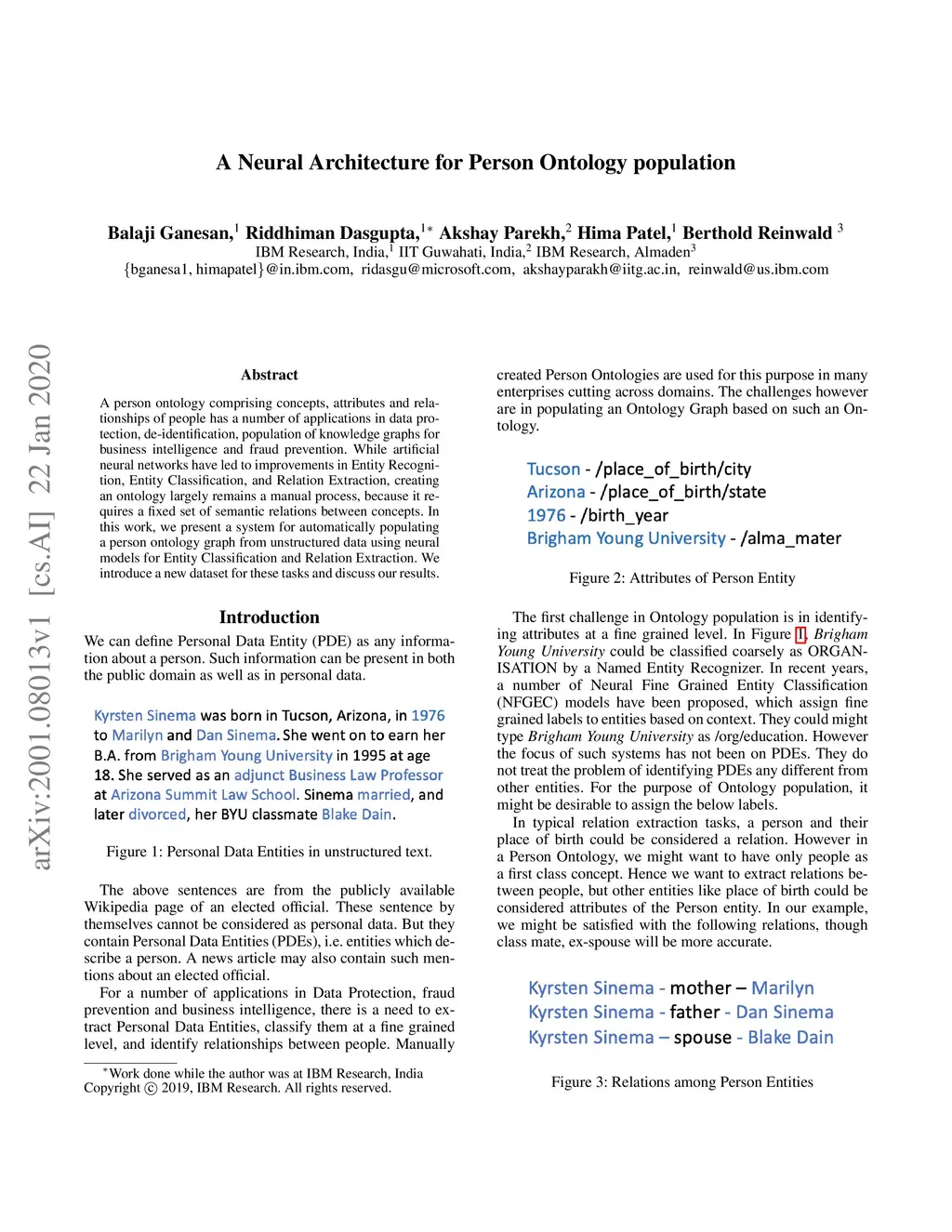 A person ontology comprising concepts, attributes and relationships of people has a number of applications in data protection, didentification, population of knowledge graphs for business intelligence and fraud prevention. While artificial neural networks have led to improvements in Entity Recognition, Entity Classification, and Relation Extraction, creating an ontology largely remains a manual process, because it requires a fixed set of semantic relations between concepts. In this work, we present a system for automatically populating a person ontology graph from unstructured data using neural models for Entity Classification and Relation Extraction. We introduce a new dataset for these tasks and discuss our results.