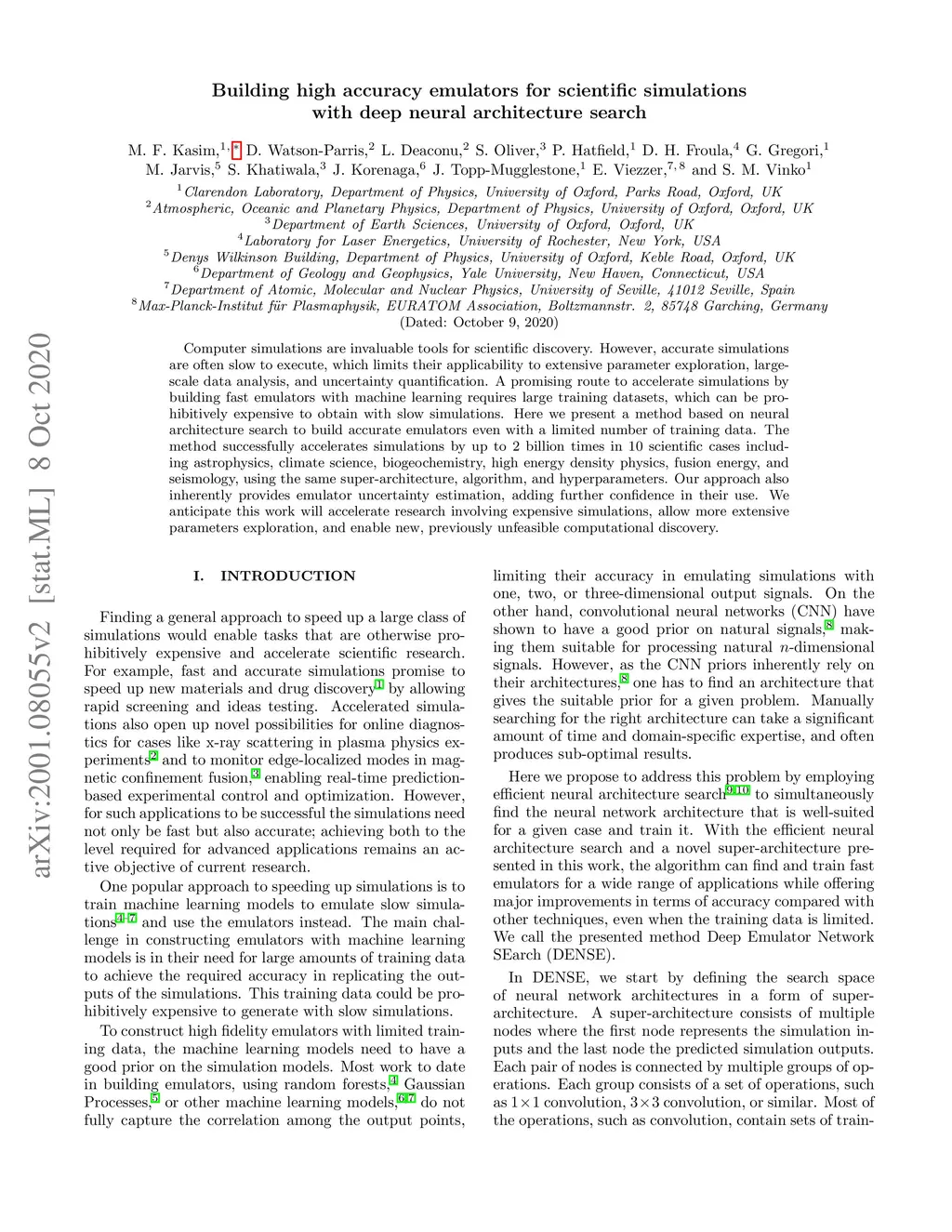 Computer simulations are invaluable tools for scientific discovery. However, accurate simulations are often slow to execute, which limits their applicability to extensive parameter exploration, large-scale data analysis, and uncertainty quantification. A promising route to accelerate simulations by building fast emulators with machine learning requires large training datasets, which can be prohibitively expensive to obtain with slow simulations. Here we present a method based on neural architecture search to build accurate emulators even with a limited number of training data. The method successfully accelerates simulations by up to 2 billion times in 10 scientific cases including astrophysics, climate science, biogeochemistry, high energy density physics, fusion energy, and seismology, using the same super-architecture, algorithm, and hyperparameters. Our approach also inherently provides emulator uncertainty estimation, adding further confidence in their use. We anticipate this work will accelerate research involving expensive simulations, allow more extensive parameters exploration, and enable new, previously unfeasible computational discovery.