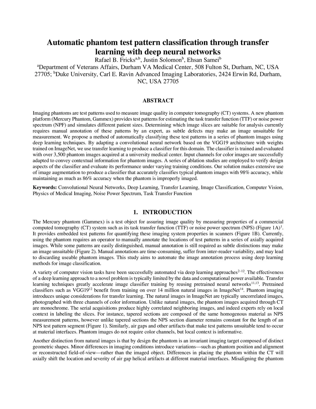 Imaging phantoms are test patterns used to measure image quality in computer tomography (CT) systems. A new phantom platform (Mercury Phantom, Gammex) provides test patterns for estimating the task transfer function (TTF) or noise power spectrum (NPF) and simulates different patient sizes. Determining which image slices are suitable for analysis currently requires manual annotation of these patterns by an expert, as subtle defects may make an image unsuitable for measurement. We propose a method of automatically classifying these test patterns in a series of phantom images using deep learning techniques. By adapting a convolutional neural network based on the VGG19 architecture with weights trained on ImageNet, we use transfer learning to produce a classifier for this domain. The classifier is trained and evaluated with over 3,500 phantom images acquired at a university medical center. Input channels for color images are successfully adapted to convey contextual information for phantom images. A series of ablation studies are employed to verify design aspects of the classifier and evaluate its performance under varying training conditions. Our solution makes extensive use of image augmentation to produce a classifier that accurately classifies typical phantom images with 98% accuracy, while maintaining as much as 86% accuracy when the phantom is improperly imaged.