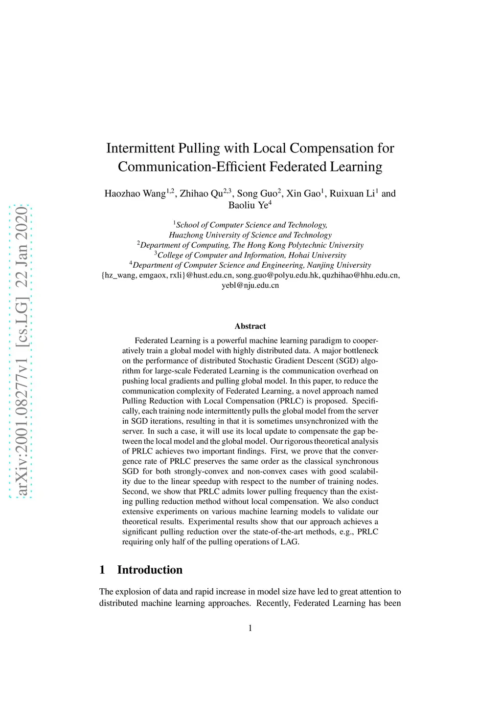 Federated Learning is a powerful machine learning paradigm to cooperatively train a global model with highly distributed data. A major bottleneck on the performance of distributed Stochastic Gradient Descent (SGD) algorithm for large-scale Federated Learning is the communication overhead on pushing local gradients and pulling global model. In this paper, to reduce the communication complexity of Federated Learning, a novel approach named Pulling Reduction with Local Compensation (PRLC) is proposed. Specifically, each training node intermittently pulls the global model from the server in SGD iterations, resulting in that it is sometimes unsynchronized with the server. In such a case, it will use its local update to compensate the gap between the local model and the global model. Our rigorous theoretical analysis of PRLC achieves two important findings. First, we prove that the convergence rate of PRLC preserves the same order as the classical synchronous SGD for both strongly-convex and non-convex cases with good scalability due to the linear speedup with respect to the number of training nodes. Second, we show that PRLC admits lower pulling frequency than the existing pulling reduction method without local compensation. We also conduct extensive experiments on various machine learning models to validate our theoretical results. Experimental results show that our approach achieves a significant pulling reduction over the state-of-the-art methods, e.g., PRLC requiring only half of the pulling operations of LAG.