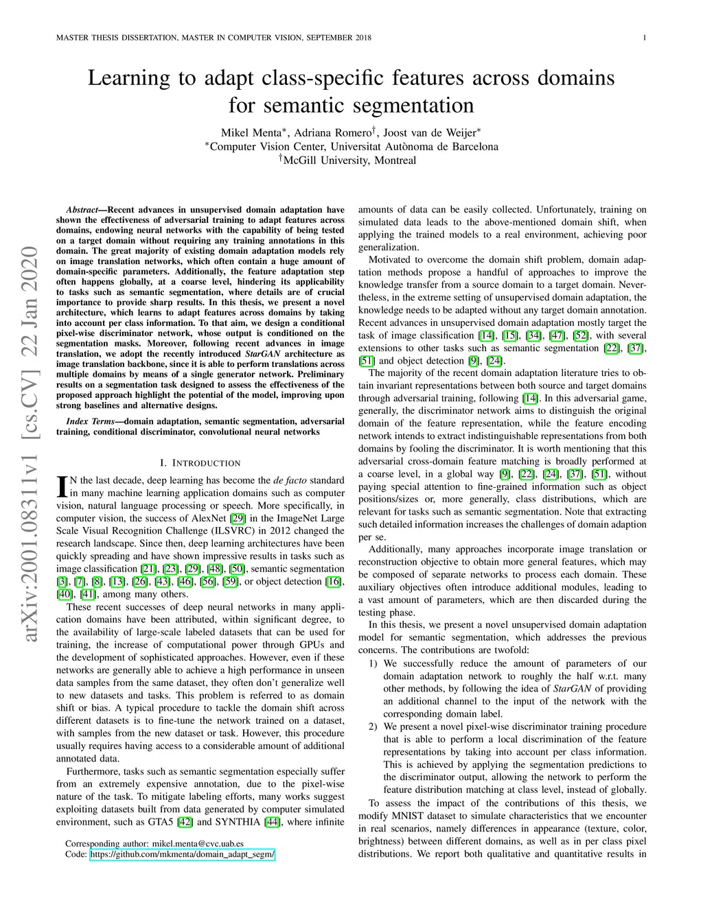 Recent advances in unsupervised domain adaptation have shown the effectiveness of adversarial training to adapt features across domains, endowing neural networks with the capability of being tested on a target domain without requiring any training annotations in this domain. The great majority of existing domain adaptation models rely on image translation networks, which often contain a huge amount of domain-specific parameters. Additionally, the feature adaptation step often happens globally, at a coarse level, hindering its applicability to tasks such as semantic segmentation, where details are of crucial importance to provide sharp results. In this thesis, we present a novel architecture, which learns to adapt features across domains by taking into account per class information. To that aim, we design a conditional pixel-wise discriminator network, whose output is conditioned on the segmentation masks. Moreover, following recent advances in image translation, we adopt the recently introduced StarGAN architecture as image translation backbone, since it is able to perform translations across multiple domains by means of a single generator network. Preliminary results on a segmentation task designed to assess the effectiveness of the proposed approach highlight the potential of the model, improving upon strong baselines and alternative designs.