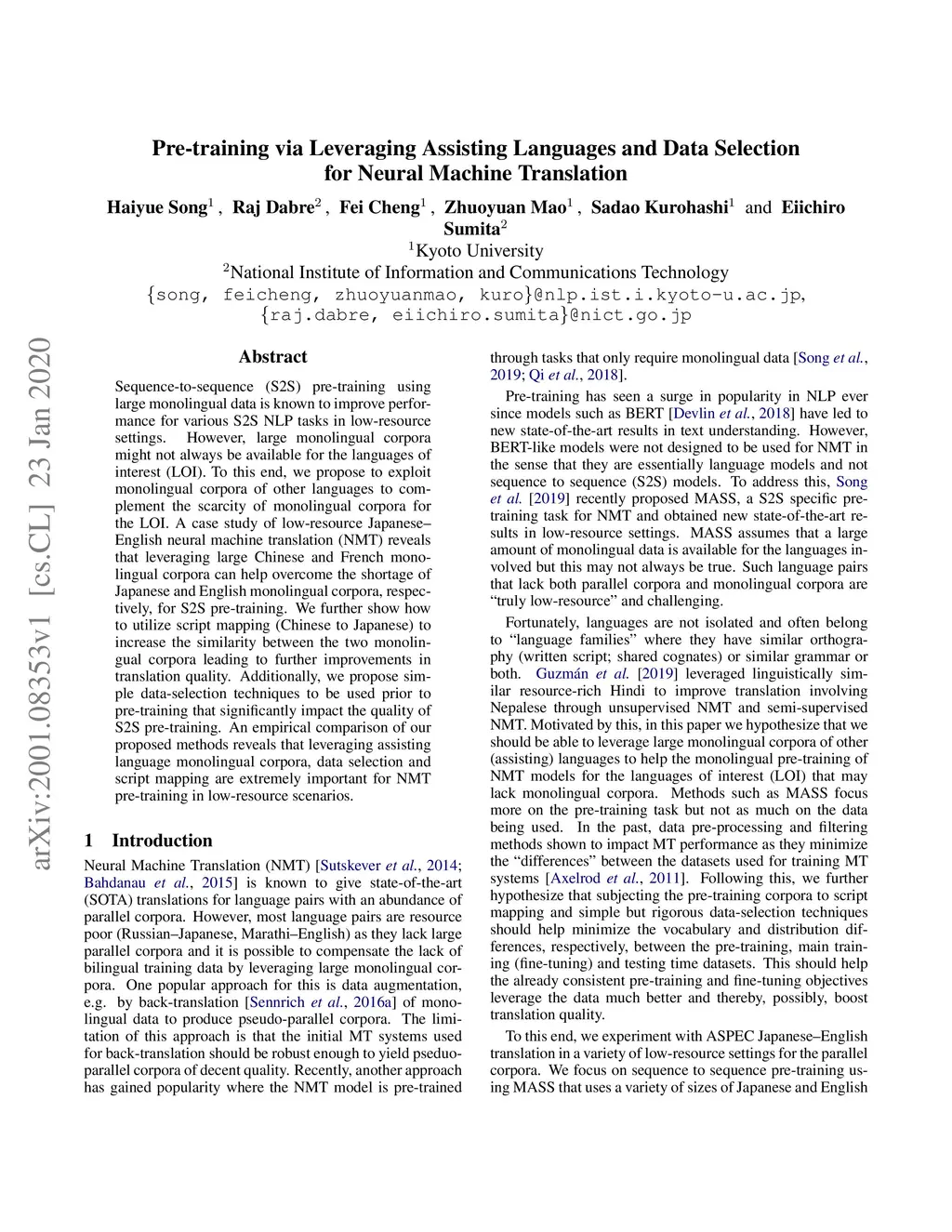 Pre-training via Leveraging Assisting Languages and Data Selection for