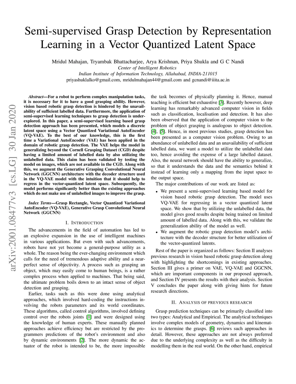 For a robot to perform complex manipulation tasks, it is necessary for it to have a good grasping ability. However, vision based robotic grasp detection is hindered by the unavailability of sufficient labelled data. Furthermore, the application of semi-supervised learning techniques to grasp detection is under-explored. In this paper, a semi-supervised learning based grasp detection approach has been presented, which models a discrete latent space using a Vector Quantized Variational AutoEncoder (VQ-VAE). To the best of our knowledge, this is the first time a Variational AutoEncoder (VAE) has been applied in the domain of robotic grasp detection. The VAE helps the model in generalizing beyond the Cornell Grasping Dataset (CGD) despite having a limited amount of labelled data by also utilizing the unlabelled data. This claim has been validated by testing the model on images, which are not available in the CGD. Along with this, we augment the Generative Grasping Convolutional Neural Network (GGCNN) architecture with the decoder structure used in the VQ-VAE model with the intuition that it should help to regress in the vector-quantized latent space. Subsequently, the model performs significantly better than the existing approaches which do not make use of unlabelled images to improve the grasp.
