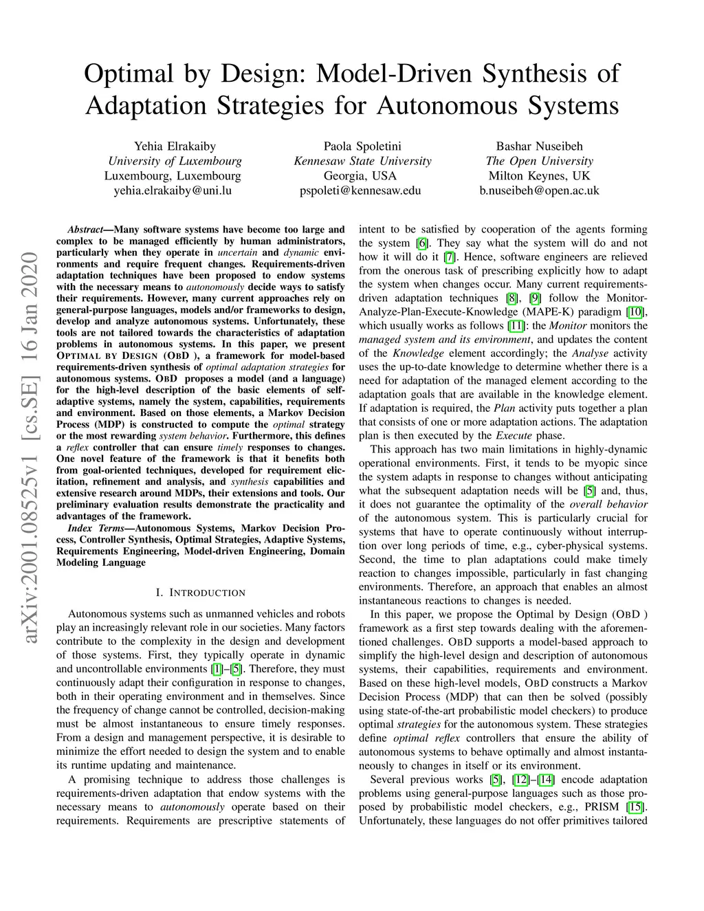 Many software systems have become too large and complex to be managed efficiently by human administrators, particularly when they operate in uncertain and dynamic environments and require frequent changes. Requirements-driven adaptation techniques have been proposed to endow systems with the necessary means to autonomously decide ways to satisfy their requirements. However, many current approaches rely on general-purpose languages, models and/or frameworks to design, develop and analyze autonomous systems. Unfortunately, these tools are not tailored towards the characteristics of adaptation problems in autonomous systems. In this paper, we present Optimal by Design (ObD ), a framework for model-based requirements-driven synthesis of optimal adaptation strategies for autonomous systems. ObD proposes a model (and a language) for the high-level description of the basic elements of self-adaptive systems, namely the system, capabilities, requirements and environment. Based on those elements, a Markov Decision Process (MDP) is constructed to compute the optimal strategy or the most rewarding system behaviour. Furthermore, this defines a reflex controller that can ensure timely responses to changes. One novel feature of the framework is that it benefits both from goal-oriented techniques, developed for requirement elicitation, refinement and analysis, and synthesis capabilities and extensive research around MDPs, their extensions and tools. Our preliminary evaluation results demonstrate the practicality and advantages of the framework.