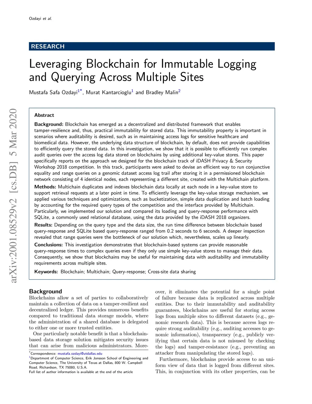 Blockchain has emerged as a decentralized and distributed framework that enables tamper-resilience and, thus, practical immutability for stored data. This immutability property is important in scenarios where auditability is desired, such as in maintaining access logs for sensitive healthcare and biomedical data.However, the underlying data structure of blockchain, by default, does not provide capabilities to efficiently query the stored data. In this investigation, we show that it is possible to efficiently run complex audit queries over the access log data stored on blockchains by using additional key-value stores. This paper specifically reports on the approach we designed for the blockchain track of iDASH Privacy & Security Workshop 2018 competition.Particularly, we implemented our solution and compared its loading and query-response performance with SQLite, a commonly used relational database, using the data provided by the iDASH 2018 organizers. Depending on the query type and the data size, the run time difference between blockchain based query-response and SQLite based query-response ranged from 0.2 seconds to 6 seconds. A deeper inspection revealed that range queries were the bottleneck of our solution which, nevertheless, scales up linearly. Concretely, this investigation demonstrates that blockchain-based systems can provide reasonable query-response times to complex queries even if they only use simple key-value stores to manage their data. Consequently, we show that blockchains may be useful for maintaining data with auditability and immutability requirements across multiple sites.