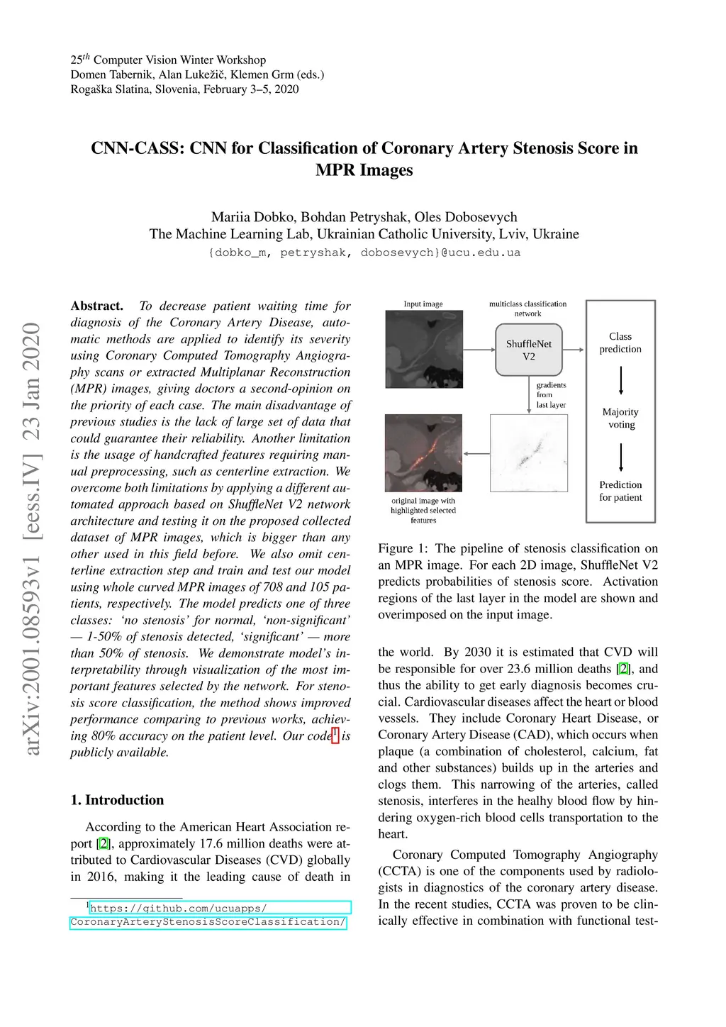 To decrease patient waiting time for diagnosis of the Coronary Artery Disease, automatic methods are applied to identify its severity using Coronary Computed Tomography Angiography scans or extracted Multiplanar Reconstruction (MPR) images, giving doctors a second-opinion on the priority of each case. The main disadvantage of previous studies is the lack of large set of data that could guarantee their reliability. Another limitation is the usage of handcrafted features requiring manual preprocessing, such as centerline extraction. We overcome both limitations by applying a different automated approach based on ShuffleNet V2 network architecture and testing it on the proposed collected dataset of MPR images, which is bigger than any other used in this field before. We also omit centerline extraction step and train and test our model using whole curved MPR images of 708 and 105 patients, respectively. The model predicts one of three classes: ño stenosis' for normal, ñon-significant' - 1-50% of stenosis detected, 'significant' - more than 50% of stenosis. We demonstrate model's interpretability through visualization of the most important features selected by the network. For stenosis score classification, the method shows improved performance comparing to previous works, achieving 80% accuracy on the patient level. Our code is publicly available.