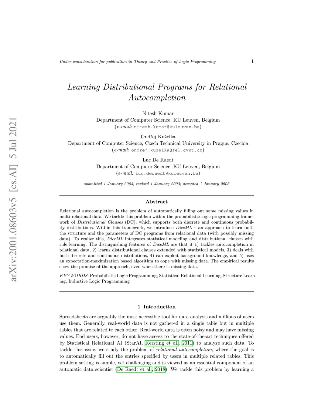 Relational autocompletion is the problem of automatically filling out some missing values in multi-relational data. We tackle this problem within the probabilistic logic programming framework of Distributional Clauses (DC), which supports both discrete and continuous probability distributions. Within this framework, we introduce DiceML -- an approach to learn both the structure and the parameters of DC programs from relational data (with possibly missing data). To realize this, DiceML integrates statistical modeling and distributional clauses with rule learning. The distinguishing features of DiceML are that it 1) tackles autocompletion in relational data, 2) learns distributional clauses extended with statistical models, 3) deals with both discrete and continuous distributions, 4) can exploit background knowledge, and 5) uses an expectation-maximization based algorithm to cope with missing data. The empirical results show the promise of the approach, even when there is missing data.