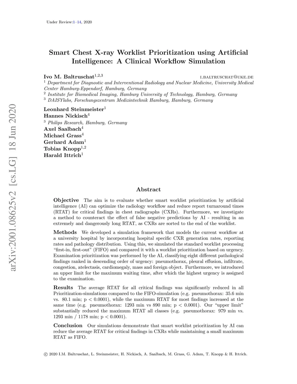 The aim is to evaluate whether smart worklist prioritization by artificial intelligence (AI) can optimize the radiology workflow and reduce report turnaround times (RTAT) for critical findings in chest radiographs (CXRs). Furthermore, we investigate a method to counteract the effect of false negative predictions by AI -- resulting in an extremely and dangerously long RTAT, as CXRs are sorted to the end of the worklist. We developed a simulation framework that models the current workflow at a university hospital by incorporating hospital specific CXR generation rates, reporting rates and pathology distribution. Using this, we simulated the standard worklist processing "first-in, first-out" (FIFO) and compared it with a worklist prioritization based on urgency. Examination prioritization was performed by the AI, classifying eight different pathological findings ranked in descending order of urgency: pneumothorax, pleural effusion, infiltrate, congestion, atelectasis, cardiomegaly, mass and foreign object. Furthermore, we introduced an upper limit for the maximum waiting time, after which the highest urgency is assigned to the examination. The average RTAT for all critical findings was significantly reduced in all Prioritization-simulations compared to the FIFO-simulation (e.g. pneumothorax: 35.6 min vs. 80.1 min; p ), while the maximum RTAT for most findings increased at the same time (e.g. pneumothorax: 1293 min vs 890 min; p ). Our "upper limit" substantially reduced the maximum RTAT all classes (e.g. pneumothorax: 979 min vs. 1293 min / 1178 min; p ). Our simulations demonstrate that smart worklist prioritization by AI can reduce the average RTAT for critical findings in CXRs while maintaining a small maximum RTAT as FIFO.