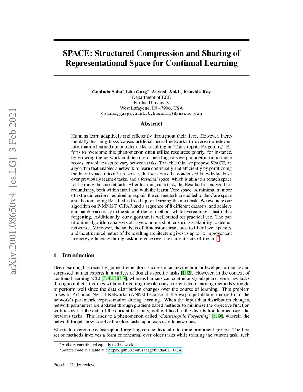Humans learn adaptively and efficiently throughout their lives. However, incrementally learning tasks causes artificial neural networks to overwrite relevant information learned about older tasks, resulting in 'Catastrophic Forgetting'. Efforts to overcome this phenomenon often utilize resources poorly, for instance, by growing the network architecture or needing to save parametric importance scores, or violate data privacy between tasks. To tackle this, we propose SPACE, an algorithm that enables a network to learn continually and efficiently by partitioning the learnt space into a Core space, that serves as the condensed knowledge base over previously learned tasks, and a Residual space, which is akin to a scratch space for learning the current task. After learning each task, the Residual is analyzed for redundancy, both within itself and with the learnt Core space. A minimal number of extra dimensions required to explain the current task are added to the Core space and the remaining Residual is freed up for learning the next task. We evaluate our algorithm on P-MNIST, CIFAR and a sequence of 8 different datasets, and achieve comparable accuracy to the state-of-the-art methods while overcoming catastrophic forgetting. Additionally, our algorithm is well suited for practical use. The partitioning algorithm analyzes all layers in one shot, ensuring scalability to deeper networks. Moreover, the analysis of dimensions translates to filter-level sparsity, and the structured nature of the resulting architecture gives us up to 5x improvement in energy efficiency during task inference over the current state-of-the-art.