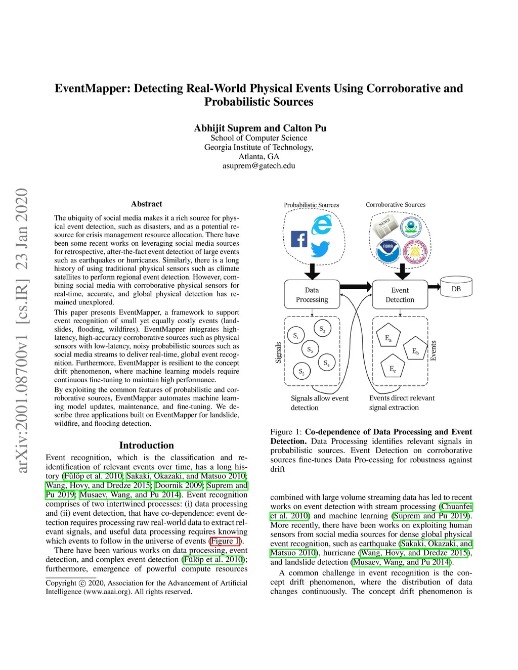 The ubiquity of social media makes it a rich source for physical event detection, such as disasters, and as a potential resource for crisis management resource allocation. There have been some recent works on leveraging social media sources for retrospective, after-the-fact event detection of large events such as earthquakes or hurricanes. Similarly, there is a long history of using traditional physical sensors such as climate satellites to perform regional event detection. However, combining social media with corroborative physical sensors for real-time, accurate, and global physical detection has remained unexplored. This paper presents EventMapper, a framework to support event recognition of small yet equally costly events (landslides, flooding, wildfires). EventMapper integrates high-latency, high-accuracy corroborative sources such as physical sensors with low-latency, noisy probabilistic sources such as social media streams to deliver real-time, global event recognition. Furthermore, EventMapper is resilient to the concept drift phenomenon, where machine learning models require continuous fine-tuning to maintain high performance. By exploiting the common features of probabilistic and corroborative sources, EventMapper automates machine learning model updates, maintenance, and fine-tuning. We describe three applications built on EventMapper for landslide, wildfire, and flooding detection.