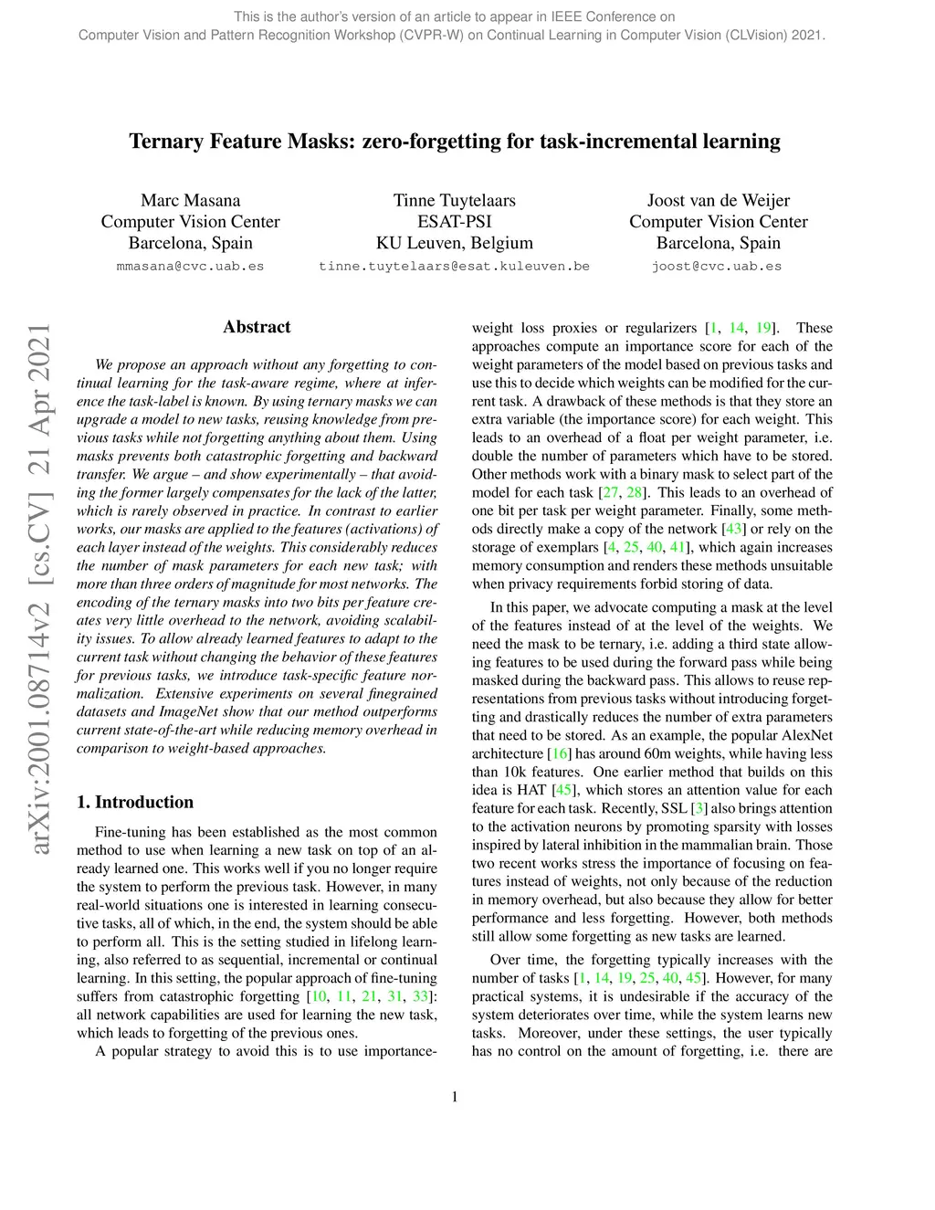 Ternary Feature Masks: zero-forgetting for task-incremental learning