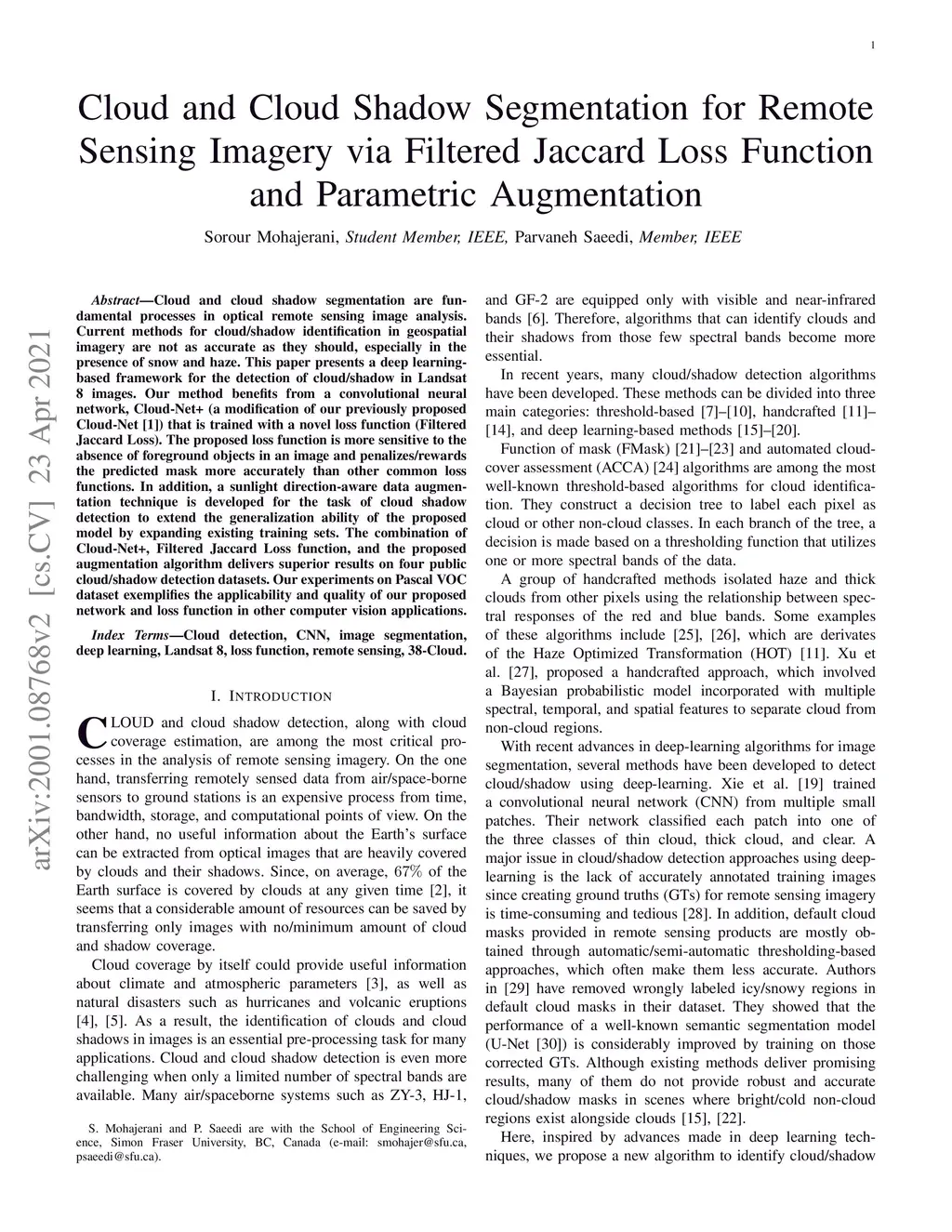 Cloud and cloud shadow segmentation are fundamental processes in optical remote sensing image analysis. Current methods for cloud/shadow identification in geospatial imagery are not as accurate as they should, especially in the presence of snow and haze. This paper presents a deep learning-based framework for the detection of cloud/shadow in Landsat 8 images. Our method benefits from a convolutional neural network, Cloud-Net+ (a modification of our previously proposed Cloud-Net \cite{myigarss}) that is trained with a novel loss function (Filtered Jaccard Loss). The proposed loss function is more sensitive to the absence of foreground objects in an image and penalizes/rewards the predicted mask more accurately than other common loss functions. In addition, a sunlight direction-aware data augmentation technique is developed for the task of cloud shadow detection to extend the generalization ability of the proposed model by expanding existing training sets. The combination of Cloud-Net+, Filtered Jaccard Loss function, and the proposed augmentation algorithm delivers superior results on four public cloud/shadow detection datasets. Our experiments on Pascal VOC dataset exemplifies the applicability and quality of our proposed network and loss function in other computer vision applications.
