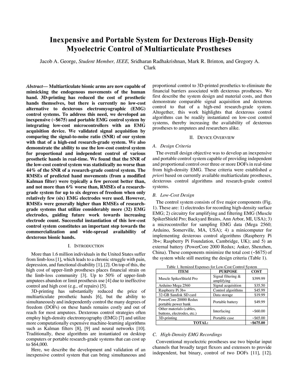 Multiarticulate bionic arms are now capable of mimicking the endogenous movements of the human hand. 3D-printing has reduced the cost of prosthetic hands themselves, but there is currently no low-cost alternative to dexterous electromyographic (EMG) control systems. To address this need, we developed an inexpensive (~$675) and portable EMG control system by integrating low-cost microcontrollers with an EMG acquisition device. We validated signal acquisition by comparing the signal-to-noise ratio (SNR) of our system with that of a high-end research-grade system. We also demonstrate the ability to use the low-cost control system for proportional and independent control of various prosthetic hands in real-time. We found that the SNR of the low-cost control system was statistically no worse than 44% of the SNR of a research-grade control system. The RMSEs of predicted hand movements (from a modified Kalman filter) were typically a few percent better than, and not more than 6% worse than, RMSEs of a research-grade system for up to six degrees of freedom when only relatively few (six) EMG electrodes were used. However, RMSEs were generally higher than RMSEs of research-grade systems that utilize considerably more (32) EMG electrodes, guiding future work towards increasing electrode count. Successful instantiation of this low-cost control system constitutes an important step towards the commercialization and wide-spread availability of dexterous bionic hands.