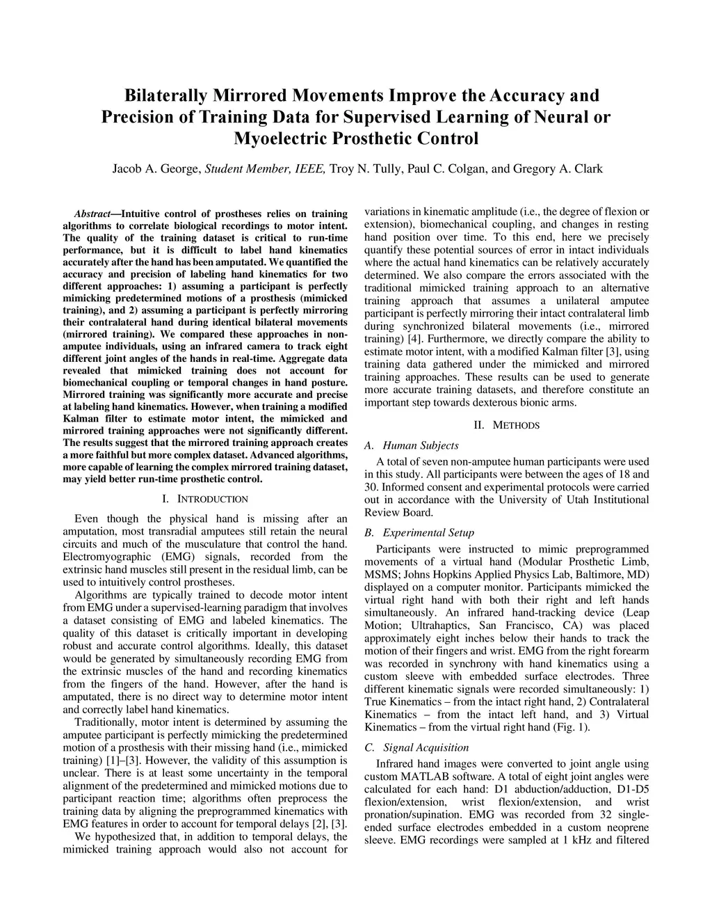 Intuitive control of prostheses relies on training algorithms to correlate biological recordings to motor intent. The quality of the training dataset is critical to run-time performance, but it is difficult to label hand kinematics accurately after the hand has been amputated. We quantified the accuracy and precision of labeling hand kinematics for two different approaches: 1) assuming a participant is perfectly mimicking predetermined motions of a prosthesis (mimicked training), and 2) assuming a participant is perfectly mirroring their contralateral hand during identical bilateral movements (mirrored training). We compared these approaches in non-amputee individuals, using an infrared camera to track eight different joint angles of the hands in real-time. Aggregate data revealed that mimicked training does not account for biomechanical coupling or temporal changes in hand posture. Mirrored training was significantly more accurate and precise at labeling hand kinematics. However, when training a modified Kalman filter to estimate motor intent, the mimicked and mirrored training approaches were not significantly different. The results suggest that the mirrored training approach creates a more faithful but more complex dataset. Advanced algorithms, more capable of learning the complex mirrored training dataset, may yield better run-time prosthetic control.
