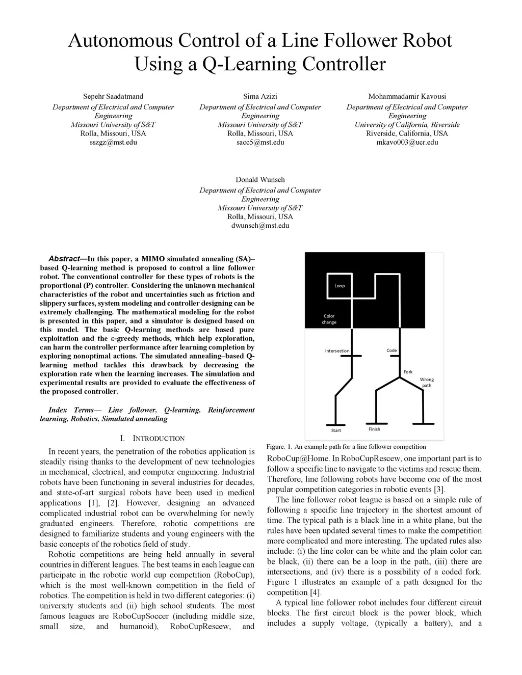 In this paper, a MIMO simulated annealing SA based Q learning method is proposed to control a line follower robot. The conventional controller for these types of robots is the proportional P controller. Considering the unknown mechanical characteristics of the robot and uncertainties such as friction and slippery surfaces, system modeling and controller designing can be extremely challenging. The mathematical modeling for the robot is presented in this paper, and a simulator is designed based on this model. The basic Q learning methods are based pure exploitation and the epsilon-greedy methods, which help exploration, can harm the controller performance after learning completion by exploring nonoptimal actions. The simulated annealing based Q learning method tackles this drawback by decreasing the exploration rate when the learning increases. The simulation and experimental results are provided to evaluate the effectiveness of the proposed controller.