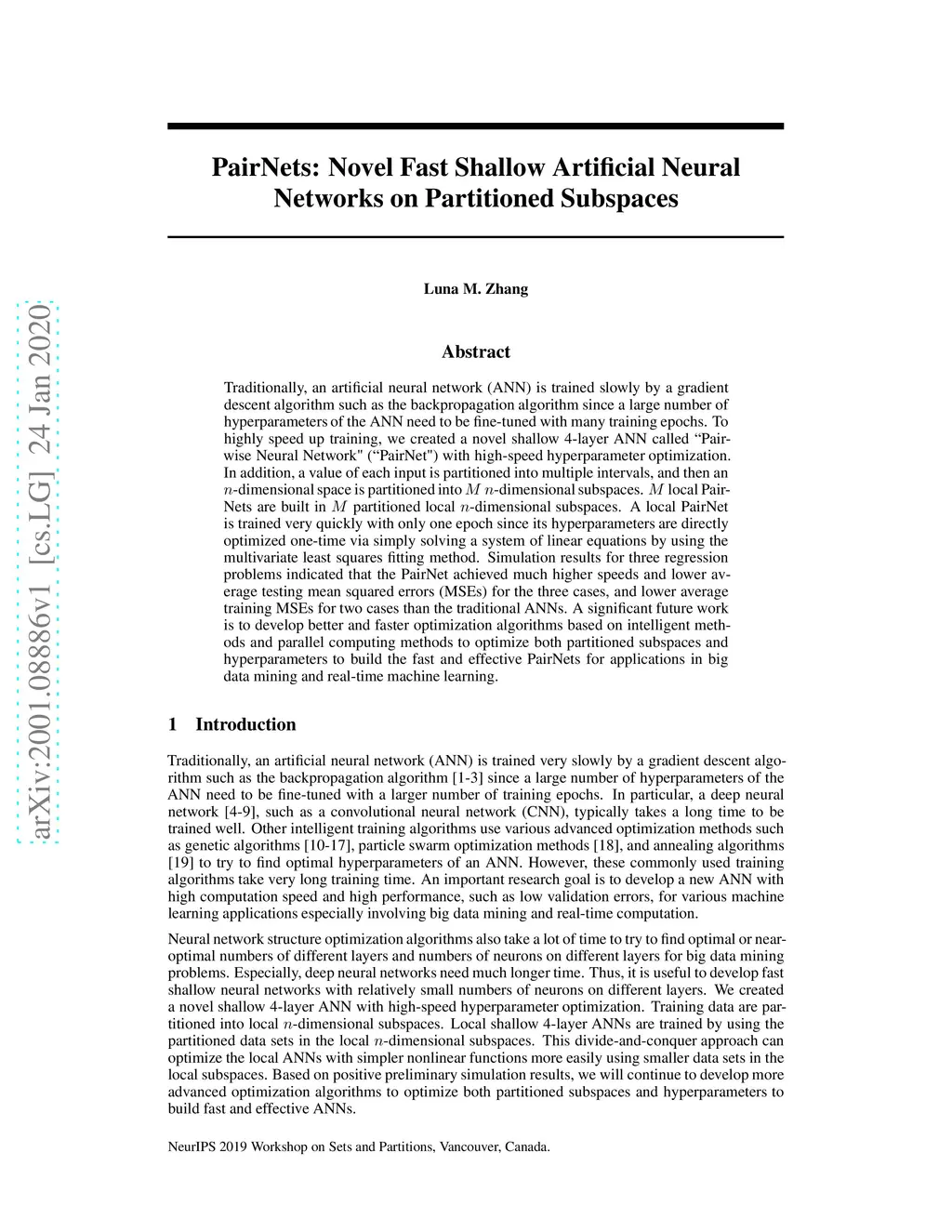PairNets: Novel Fast Shallow Artificial Neural Networks on Partitioned