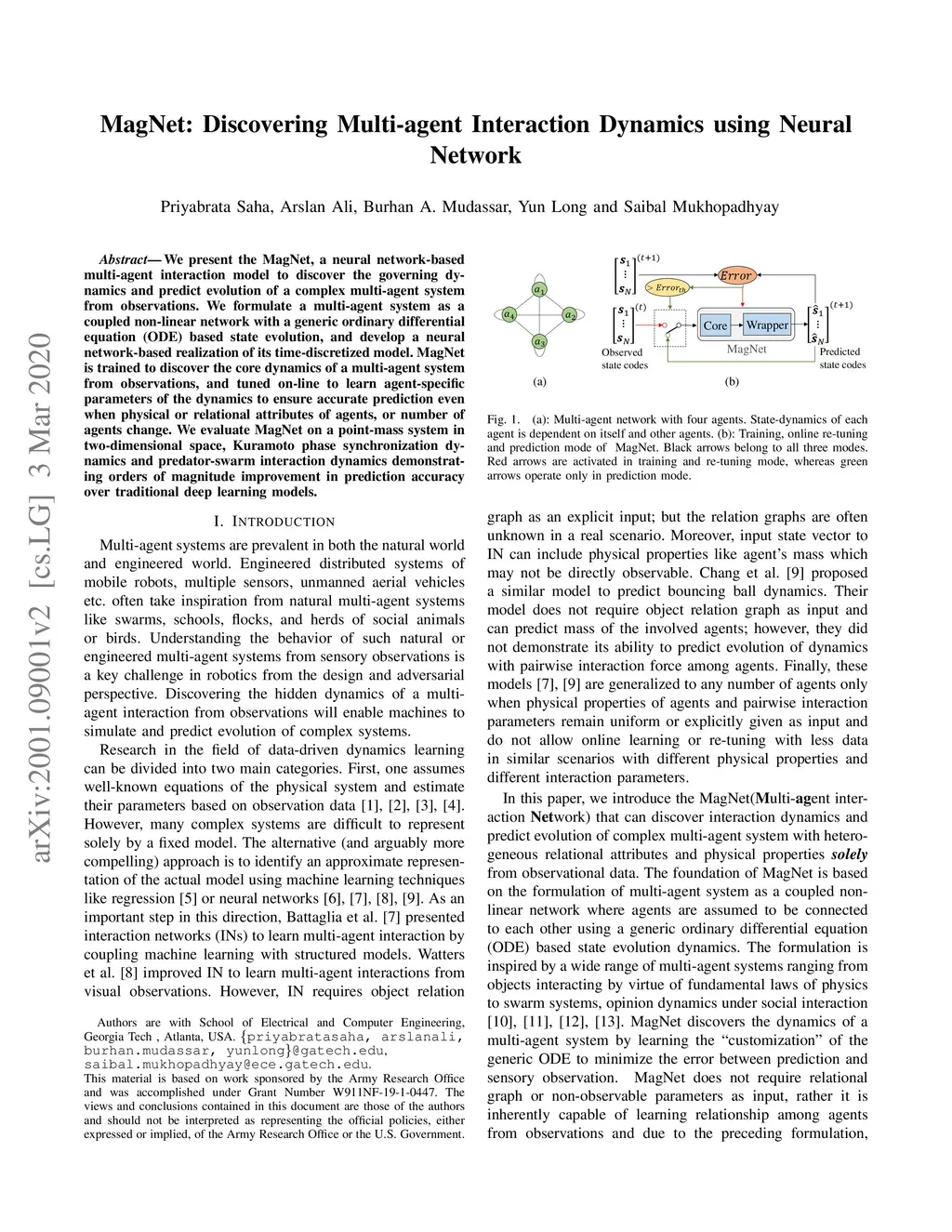 We present the MagNet, a neural network-based multi-agent interaction model to discover the governing dynamics and predict evolution of a complex multi-agent system from observations. We formulate a multi-agent system as a coupled non-linear network with a generic ordinary differential equation (ODE) based state evolution, and develop a neural network-based realization of its time-discretized model. MagNet is trained to discover the core dynamics of a multi-agent system from observations, and tuned on-line to learn agent-specific parameters of the dynamics to ensure accurate prediction even when physical or relational attributes of agents, or number of agents change. We evaluate MagNet on a point-mass system in two-dimensional space, Kuramoto phase synchronization dynamics and predator-swarm interaction dynamics demonstrating orders of magnitude improvement in prediction accuracy over traditional deep learning models.