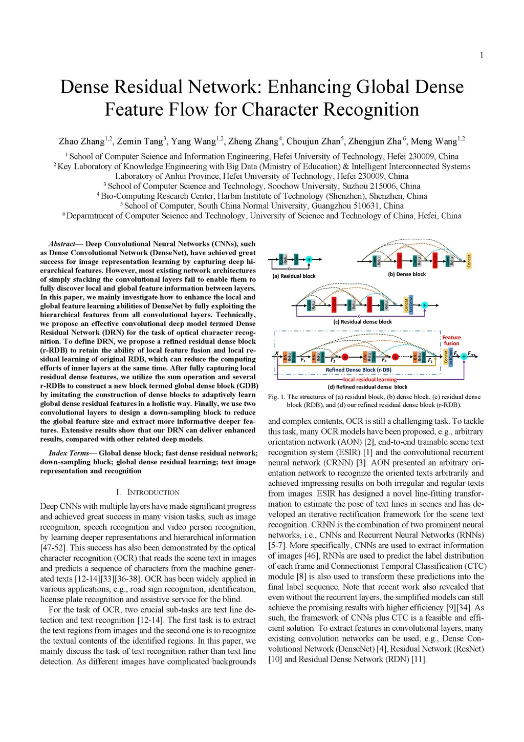 Deep Convolutional Neural Networks (CNNs), such as Dense Convolutional Networks (DenseNet), have achieved great success for image representation by discovering deep hierarchical information. However, most existing networks simply stacks the convolutional layers and hence failing to fully discover local and global feature information among layers. In this paper, we mainly explore how to enhance the local and global dense feature flow by exploiting hierarchical features fully from all the convolution layers. Technically, we propose an efficient and effective CNN framework, i.e., Fast Dense Residual Network (FDRN), for text recognition. To construct FDRN, we propose a new fast residual dense block (f-RDB) to retain the ability of local feature fusion and local residual learning of original RDB, which can reduce the computing efforts at the same time. After fully learning local residual dense features, we utilize the sum operation and several f-RDBs to define a new block termed global dense block (GDB) by imitating the construction of dense blocks to learn global dense residual features adaptively in a holistic way. Finally, we use two convolution layers to construct a down-sampling block to reduce the global feature size and extract deeper features. Extensive simulations show that FDRN obtains the enhanced recognition results, compared with other related models.