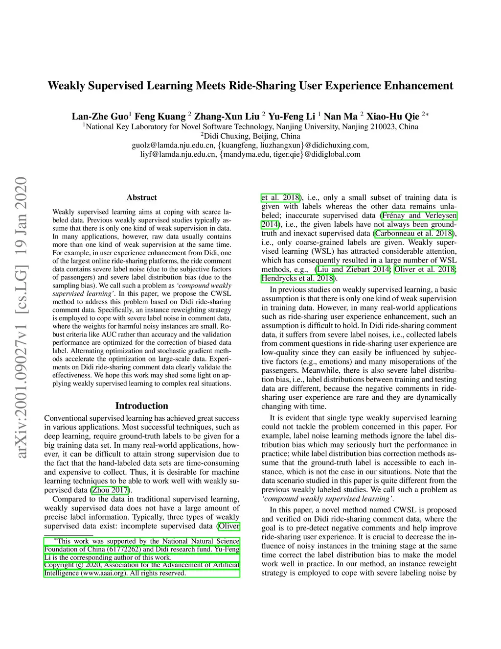 Weakly supervised learning aims at coping with scarce labeled data. Previous weakly supervised studies typically assume that there is only one kind of weak supervision in data. In many applications, however, raw data usually contains more than one kind of weak supervision at the same time. For example, in user experience enhancement from Didi, one of the largest online ride-sharing platforms, the ride comment data contains severe label noise (due to the subjective factors of passengers) and severe label distribution bias (due to the sampling bias). We call such a problem as "compound weakly supervised learning". In this paper, we propose the CWSL method to address this problem based on Didi ride-sharing comment data. Specifically, an instance reweighting strategy is employed to cope with severe label noise in comment data, where the weights for harmful noisy instances are small. Robust criteria like AUC rather than accuracy and the validation performance are optimized for the correction of biased data label. Alternating optimization and stochastic gradient methods accelerate the optimization on large-scale data. Experiments on Didi ride-sharing comment data clearly validate the effectiveness. We hope this work may shed some light on applying weakly supervised learning to complex real situations.