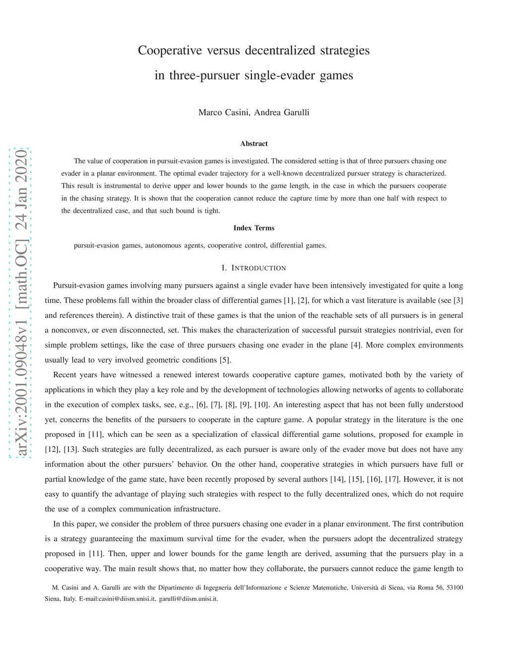 The value of cooperation in pursuit-evasion games is investigated. The considered setting is that of three pursuers chasing one evader in a planar environment. The optimal evader trajectory for a well-known decentralized pursuer strategy is characterized. This result is instrumental to derive upper and lower bounds to the game length, in the case in which the pursuers cooperate in the chasing strategy. It is shown that the cooperation cannot reduce the capture time by more than one half with respect to the decentralized case, and that such bound is tight.