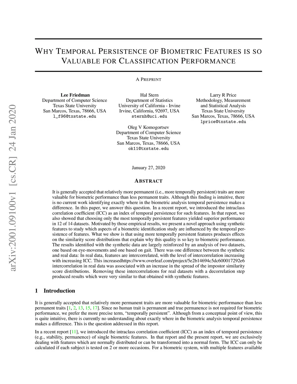 It is generally accepted that relatively more permanent (i.e., more temporally persistent) traits are more valuable for biometric performance than less permanent traits. Although this finding is intuitive, there is no current work identifying exactly where in the biometric analysis temporal persistence makes a difference. In this paper, we answer this question. In a recent report, we introduced the intraclass correlation coefficient (ICC) as an index of temporal persistence for such features. In that report, we also showed that choosing only the most temporally persistent features yielded superior performance in 12 of 14 datasets. Motivated by those empirical results, we present a novel approach using synthetic features to study which aspects of a biometric identification study are influenced by the temporal persistence of features. What we show is that using more temporally persistent features produces effects on the similarity score distributions that explain why this quality is so key to biometric performance. The results identified with the synthetic data are largely reinforced by an analysis of two datasets, one based on eye-movements and one based on gait. There was one difference between the synthetic and real data: In real data, features are intercorrelated, with the level of intercorrelation increasing with increasing ICC. This increasedhttps://www.overleaf.com/project/5e2b14694c5dc600017292e6 intercorrelation in real data was associated with an increase in the spread of the impostor similarity score distributions. Removing these intercorrelations for real datasets with a decorrelation step produced results which were very similar to that obtained with synthetic features.