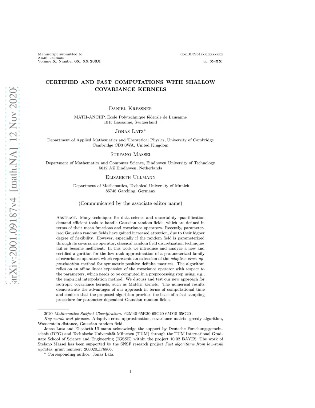 Many techniques for data science and uncertainty quantification demand efficient tools to handle Gaussian random fields, which are defined in terms of their mean functions and covariance operators. Recently, parameterized Gaussian random fields have gained increased attention, due to their higher degree of flexibility. However, especially if the random field is parameterized through its covariance operator, classical random field discretization techniques fail or become inefficient. In this work we introduce and analyze a new and certified algorithm for the low-rank approximation of a parameterized family of covariance operators which represents an extension of the adaptive cross approximation method for symmetric positive definite matrices. The algorithm relies on an affine linear expansion of the covariance operator with respect to the parameters, which needs to be computed in a preprocessing step using, e.g., the empirical interpolation method. We discuss and test our new approach for isotropic covariance kernels, such as Mat\érn kernels. The numerical results demonstrate the advantages of our approach in terms of computational time and confirm that the proposed algorithm provides the basis of a fast sampling procedure for parameter dependent Gaussian random fields.