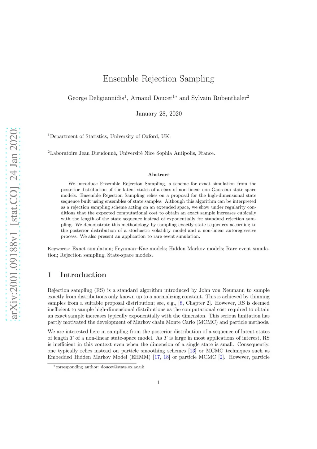 We introduce Ensemble Rejection Sampling, a scheme for exact simulation from the posterior distribution of the latent states of a class of non-linear non-Gaussian state-space models. Ensemble Rejection Sampling relies on a proposal for the high-dimensional state sequence built using ensembles of state samples. Although this algorithm can be interpreted as a rejection sampling scheme acting on an extended space, we show under regularity conditions that the expected computational cost to obtain an exact sample increases cubically with the length of the state sequence instead of exponentially for standard rejection sampling. We demonstrate this methodology by sampling exactly state sequences according to the posterior distribution of a stochastic volatility model and a non-linear autoregressive process. We also present an application to rare event simulation.