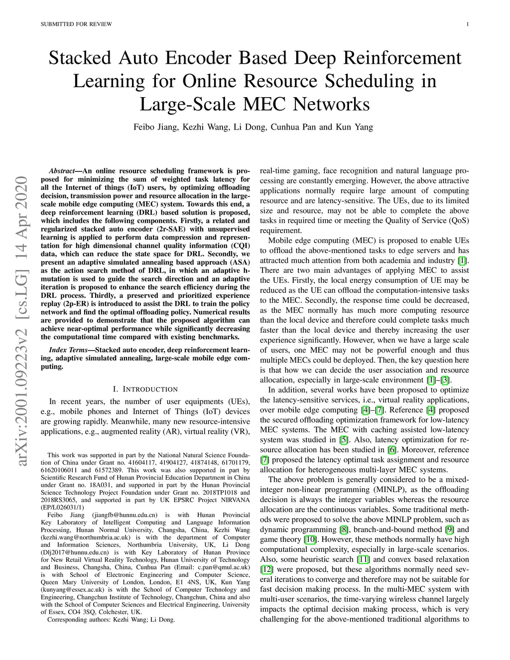 An online resource scheduling framework is proposed for minimizing the sum of weighted task latency for all the Internet of things (IoT) users, by optimizing offloading decision, transmission power and resource allocation in the large-scale mobile edge computing (MEC) system. Towards this end, a deep reinforcement learning (DRL) based solution is proposed, which includes the following components. Firstly, a related and regularized stacked auto encoder (2r-SAE) with unsupervised learning is applied to perform data compression and representation for high dimensional channel quality information (CQI) data, which can reduce the state space for DRL. Secondly, we present an adaptive simulated annealing based approach (ASA) as the action search method of DRL, in which an adaptive h-mutation is used to guide the search direction and an adaptive iteration is proposed to enhance the search efficiency during the DRL process. Thirdly, a preserved and prioritized experience replay (2p-ER) is introduced to assist the DRL to train the policy network and find the optimal offloading policy. Numerical results are provided to demonstrate that the proposed algorithm can achieve near-optimal performance while significantly decreasing the computational time compared with existing benchmarks.