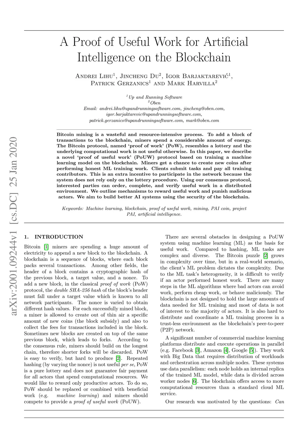 Bitcoin mining is a wasteful and resource-intensive process. To add a block of transactions to the blockchain, miners spend a considerable amount of energy. The Bitcoin protocol, named 'proof of work' (PoW), resembles a lottery and the underlying computational work is not useful otherwise. In this paper, we describe a novel 'proof of useful work' (PoUW) protocol based on training a machine learning model on the blockchain. Miners get a chance to create new coins after performing honest ML training work. Clients submit tasks and pay all training contributors. This is an extra incentive to participate in the network because the system does not rely only on the lottery procedure. Using our consensus protocol, interested parties can order, complete, and verify useful work in a distributed environment. We outline mechanisms to reward useful work and punish malicious actors. We aim to build better AI systems using the security of the blockchain.