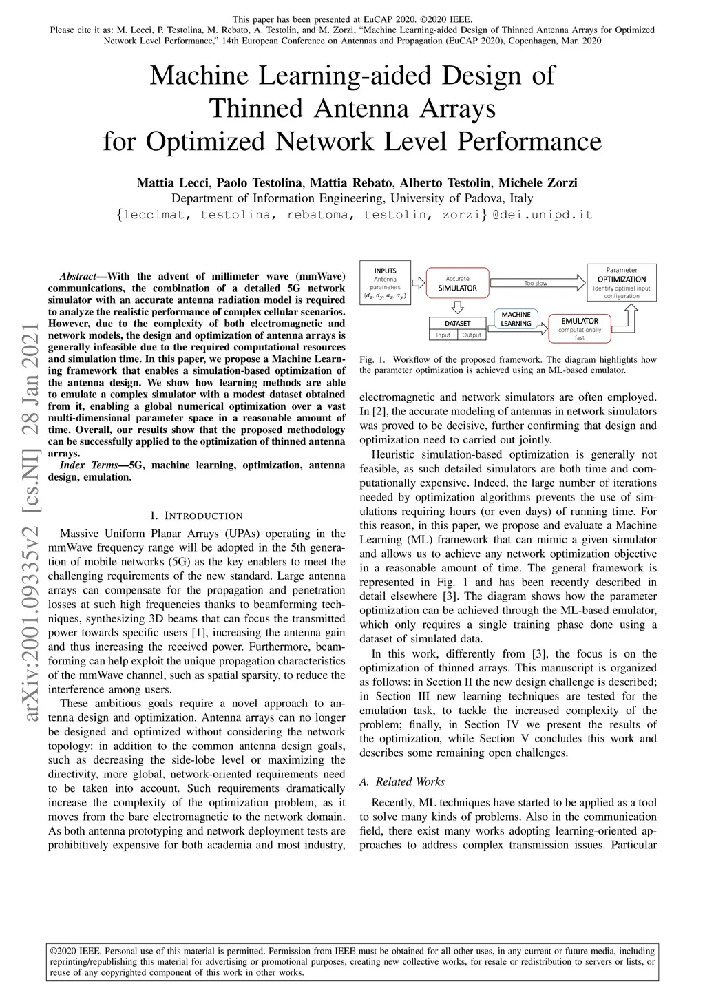 With the advent of millimeter wave (mmWave) communications, the combination of a detailed 5G network simulator with an accurate antenna radiation model is required to analyze the realistic performance of complex cellular scenarios. However, due to the complexity of both electromagnetic and network models, the design and optimization of antenna arrays is generally infeasible due to the required computational resources and simulation time. In this paper, we propose a Machine Learning framework that enables a simulation-based optimization of the antenna design. We show how learning methods are able to emulate a complex simulator with a modest dataset obtained from it, enabling a global numerical optimization over a vast multi-dimensional parameter space in a reasonable amount of time. Overall, our results show that the proposed methodology can be successfully applied to the optimization of thinned antenna arrays.