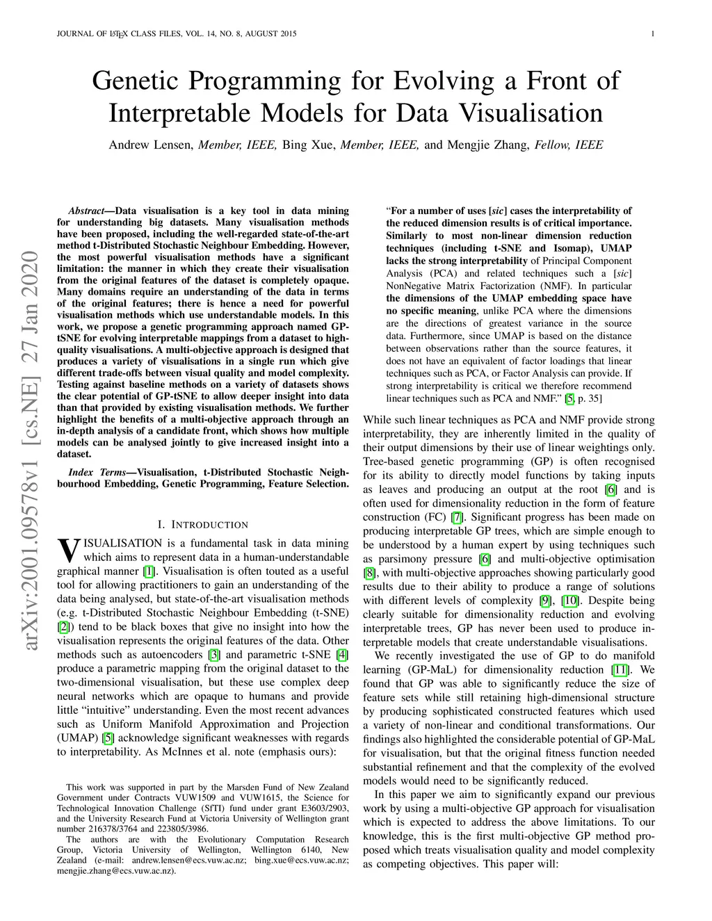 Data visualisation is a key tool in data mining for understanding big datasets. Many visualisation methods have been proposed, including the well-regarded state-of-the-art method t-Distributed Stochastic Neighbour Embedding. However, the most powerful visualisation methods have a significant limitation: the manner in which they create their visualisation from the original features of the dataset is completely opaque. Many domains require an understanding of the data in terms of the original features; there is hence a need for powerful visualisation methods which use understandable models. In this work, we propose a genetic programming approach named GPtSNE for evolving interpretable mappings from a dataset to highquality visualisations. A multi-objective approach is designed that produces a variety of visualisations in a single run which give different trade-offs between visual quality and model complexity. Testing against baseline methods on a variety of datasets shows the clear potential of GP-tSNE to allow deeper insight into data than that provided by existing visualisation methods. We further highlight the benefits of a multi-objective approach through an in-depth analysis of a candidate front, which shows how multiple models can
